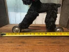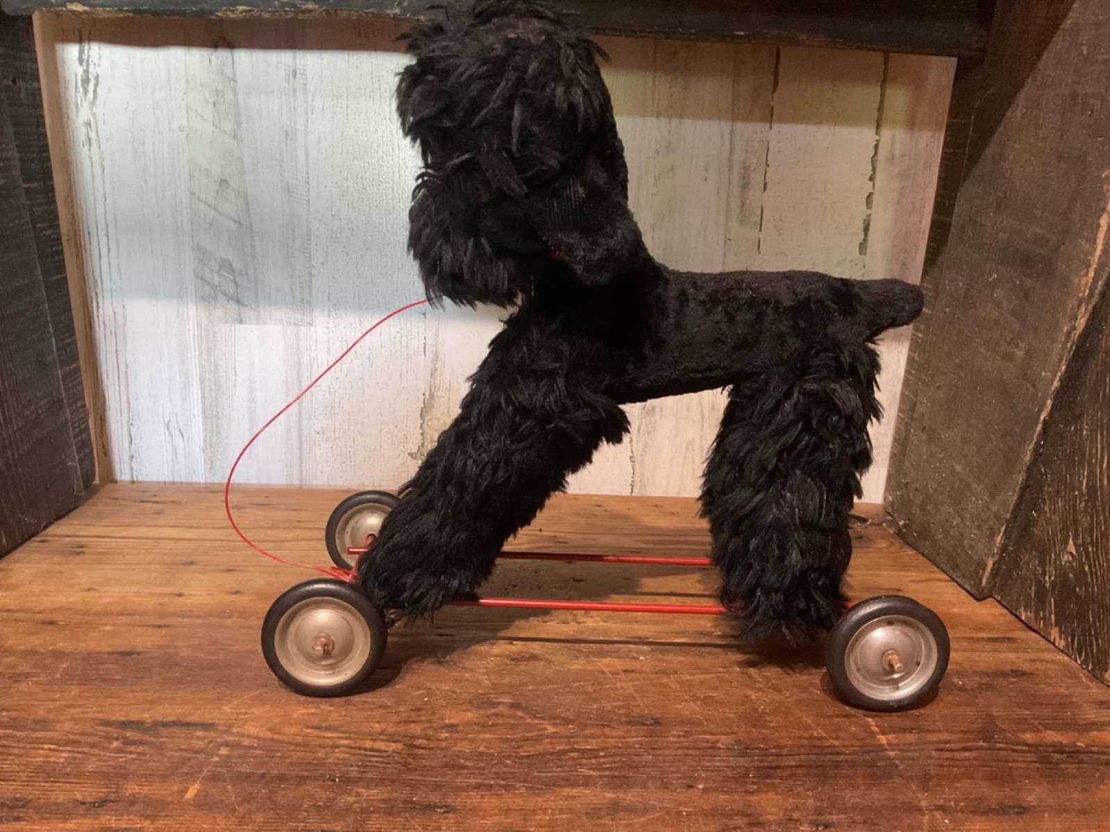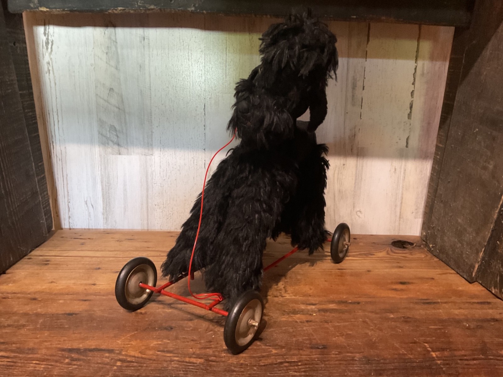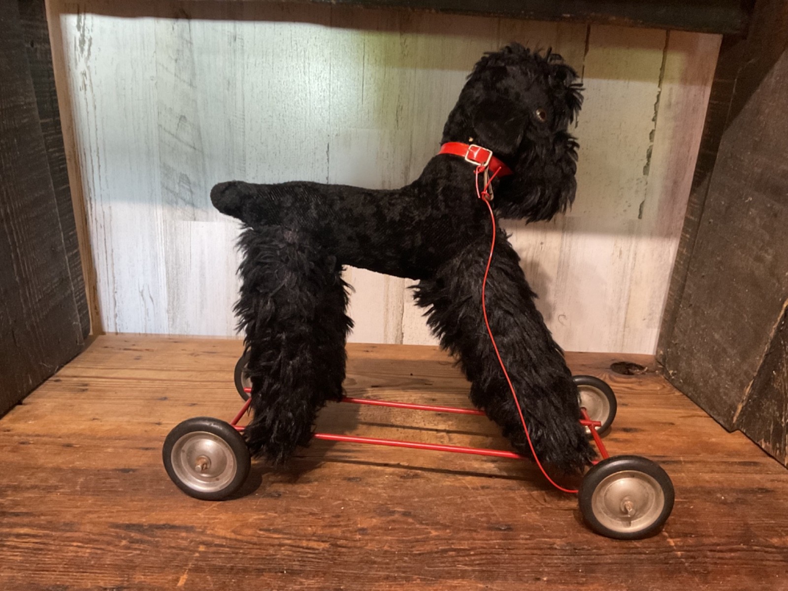 Unbranded stuffed dog on wheel base, push/pull along toy. I believe the dog is straw stuffed with a red collar and red vinyl pull along string. Super cute vintage toy. Measures 14 1/2” tall to top of dog head when on wheels and 14 1/2” wide from front wheel to back wheel. Note, when shipping will take the dog off the wheel base and wrap wheel base well to avoid it damaging the stuffed dog. Items are being purchased as noted in description in addition to pictures, so please take note of both. I appreciate prompt payment within 3 days of winning bid/purchase and will ship items within 3 business days upon receipt of payment. Please view shipping method as I typically ship USPS, most cost effective route, unless noted otherwise or a second shipping option is included/selected. No refunds are made due to an item arriving as shown in pictures and in description.