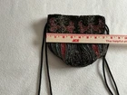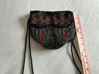 This Vintage Black Hand Beaded Drawstring Evening Bag is a beautifully crafted accessory perfect for formal occasions like weddings and parties. The semi-circle shaped bag features intricate black and red and green and gold and blue beadwork and a drawstring closure for a sophisticated look. The bag has a small size with a shoulder straps finished with black beads. and is lined with black polyester material for a sleek finish. Handmade in China, this unique piece exudes vintage charm with its iridescent exterior and lined interior, making it a stylish addition to any woman's wardrobe. Excellent condition. I have used this little bag for special occasions for many years.