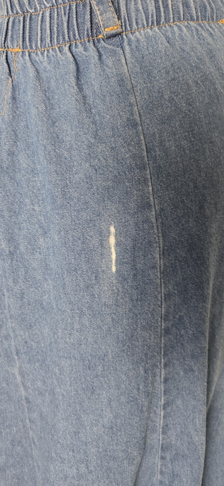 Super cute skirt, but unfortunately, it has a bleach mark on the back. 24" waist, has elastic on back 38" length