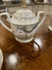 This vintage tea set is a beautiful addition to any collection. Made in Japan with intricate details, it is a true representation of Japanese culture. The set includes a teapot, creamer, sugar bowl, and six cups and saucers, all adorned with a majestic dragon design. The provenance of this set is not available, but it is certain to impress any collector or tea enthusiast. Perfect for entertaining guests or displaying in your home, this Moriage Dragon Ware tea set is a must-have for anyone who appreciates Japanese art and design.