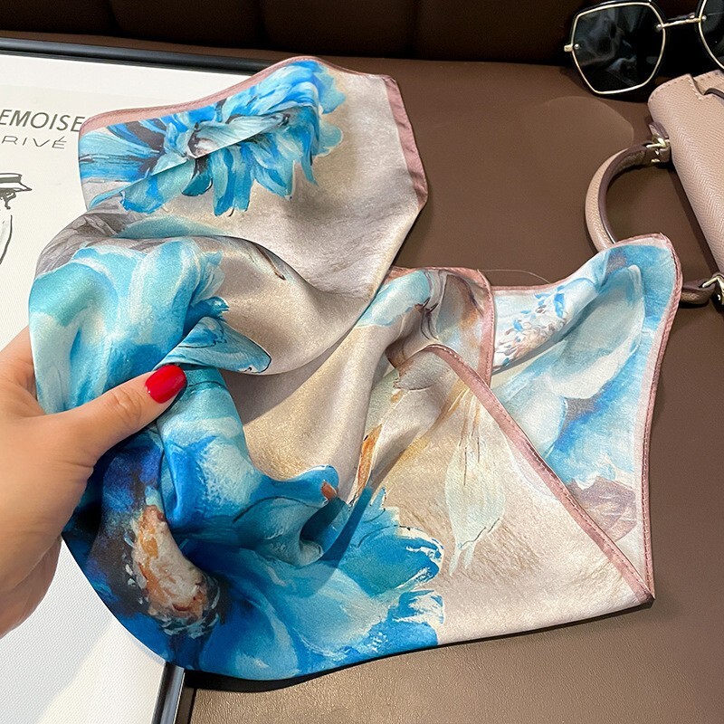 $ 16.96100% Silk Mulberry 26" Square Scarf in Beige Oil Painting Print for Women