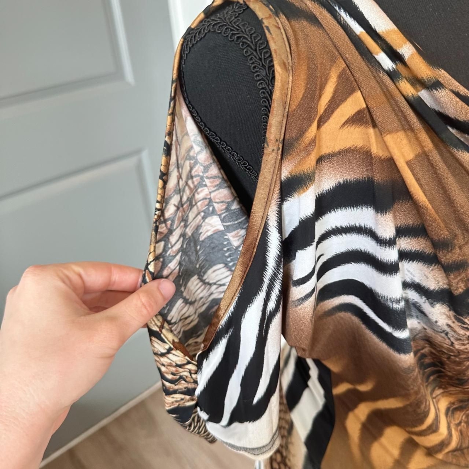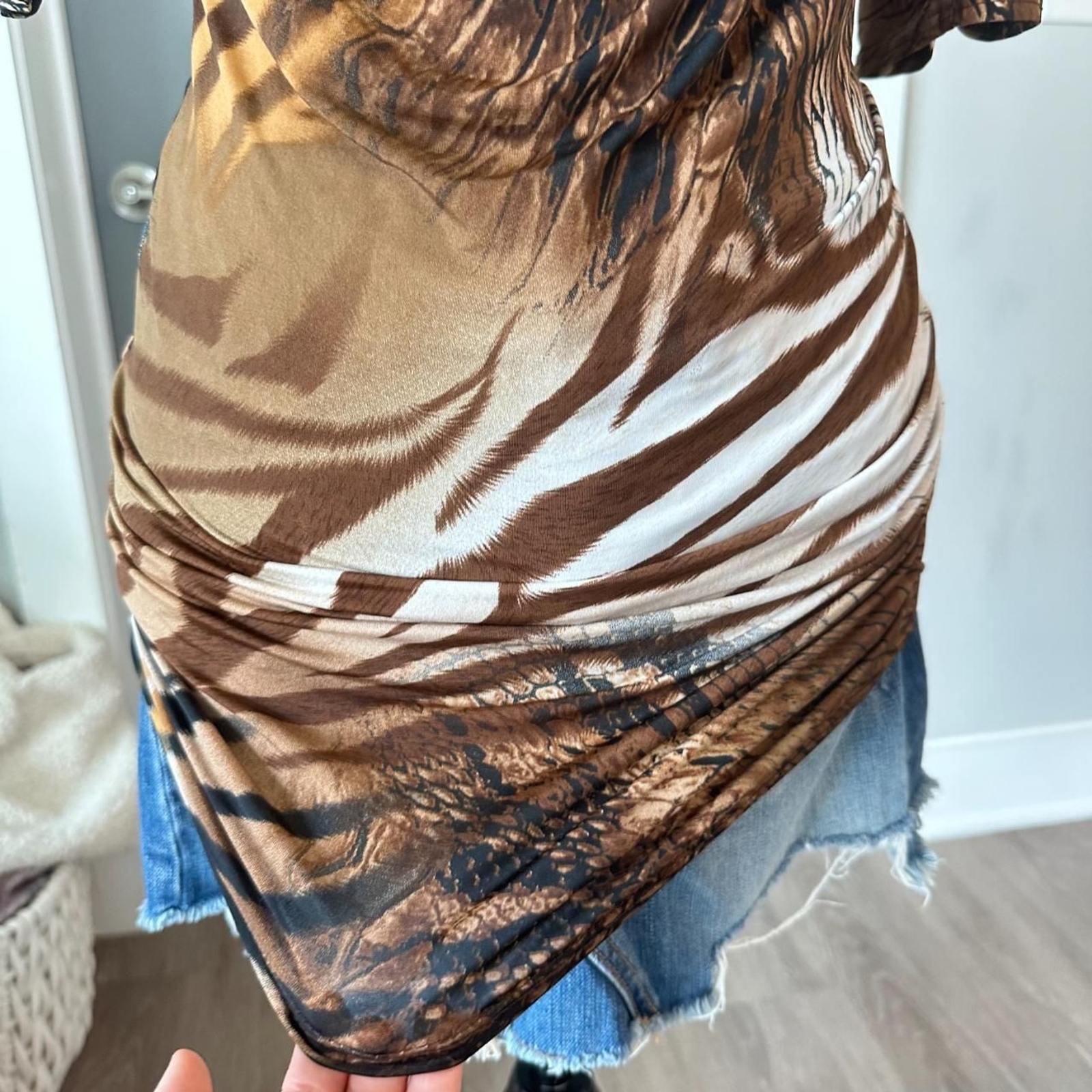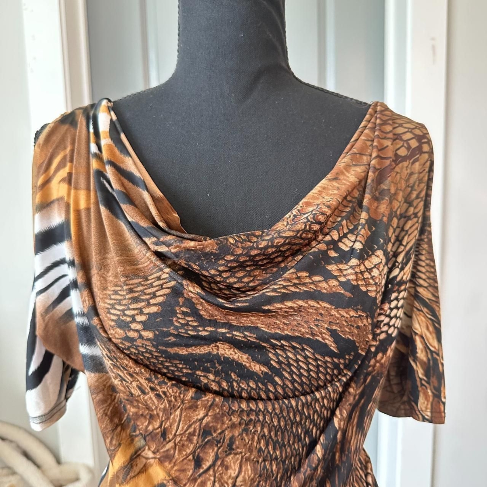 Vintage Body Central Zebra Print Top \ Y2K 2000s Brown Cowl-Neck Animal Print Blouse with Cut-Out Shoulder Detailing & V-Neck Back π Size: SM [Mannequin wears a SM] π Brand: Body Central π Condition: In perfect condition! No known flaws. #bodycentral #y2k #animalprint #cowlneck #2000s