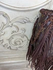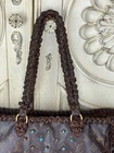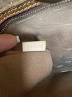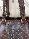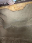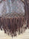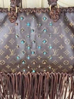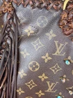 The Vintage Boho ReVamp Louis Vuitton Tote Bag is a medium-sized handbag made from real leather with fringe accents, featuring a brown exterior and gold hardware. It has a fabric lining in beige, with a cross-body strap for added versatility. The brown leather handle/strap adds a touch of luxury to this stylish tote bag, perfect for women looking to make a statement with their fashion this bag is in good condition added real leather to converted in a unique boho style.