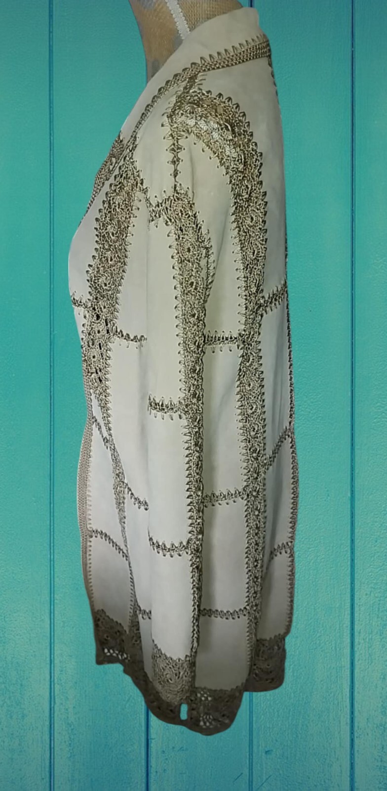 Elevate your wardrobe with the Vintage Boho Suede & Crochet Duster Jacket, a perfect blend of timeless style and bohemian flair. The patchwork design exudes a laid-back, festival vibe, making it an ideal choice for those who love to stand out. Crafted with a high-quality leather outer shell and a matching leather lining, this jacket promises both durability and comfort. Available in a versatile beige hue, the jacket features a regular size M fit that caters to a range of body types. The longline silhouette and intricate crochet details add a touch of sophistication to the overall duster style, ensuring it's a piece you'll reach for season after season. Size Med Measurements: Legnth 40" Sleeve 23" Pit to Pit 22"