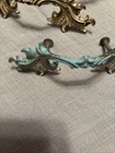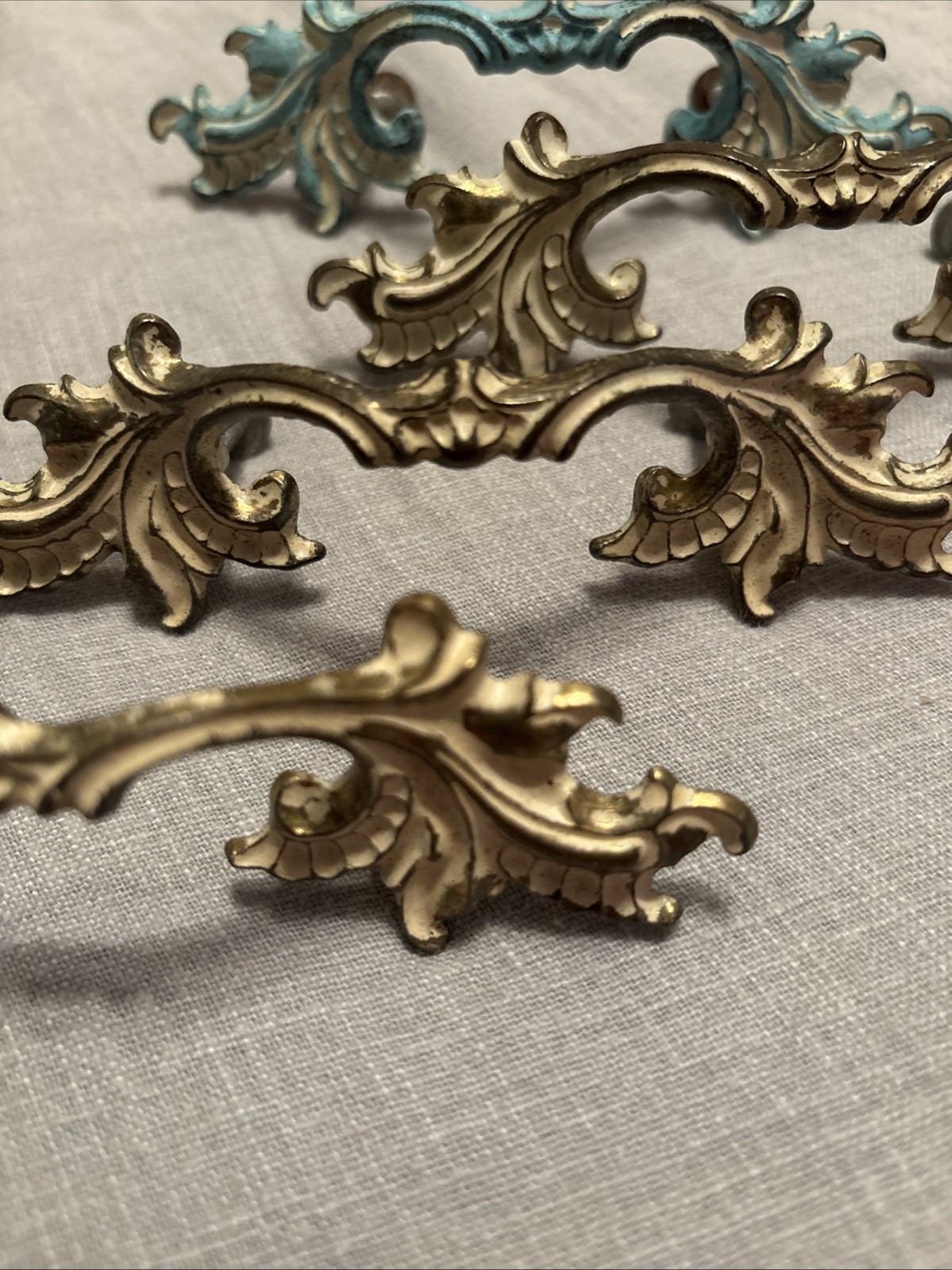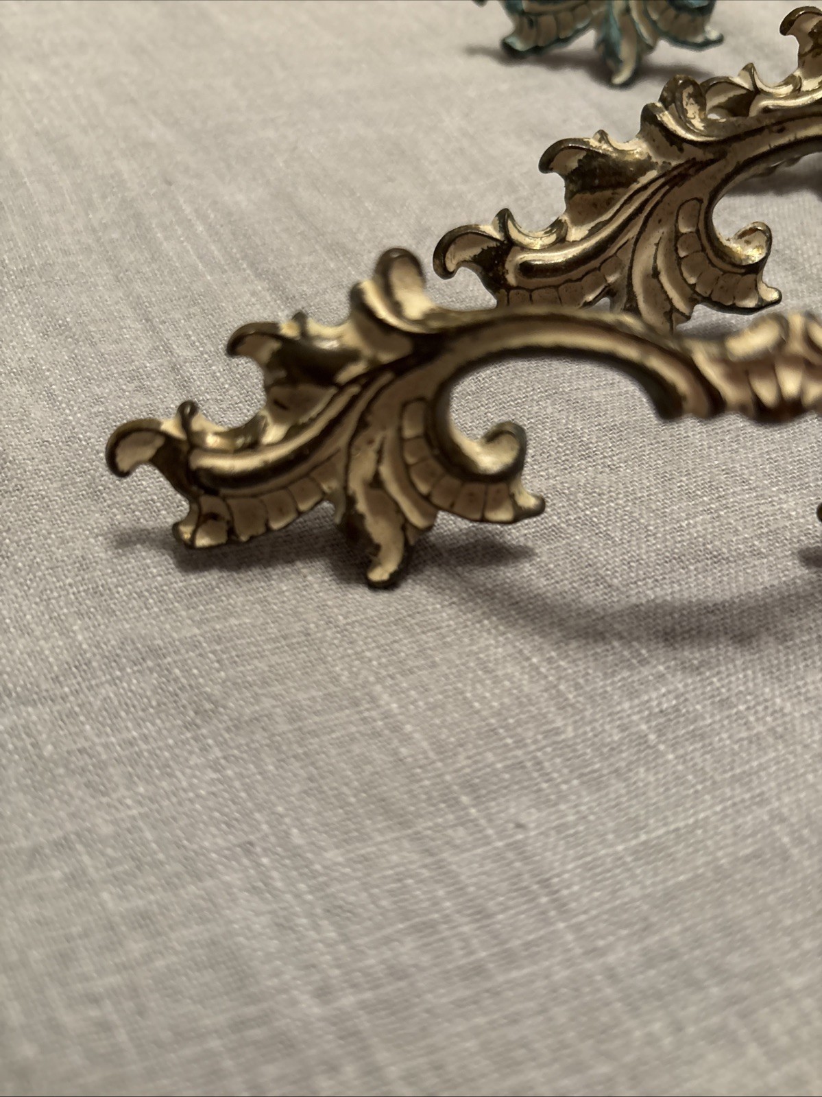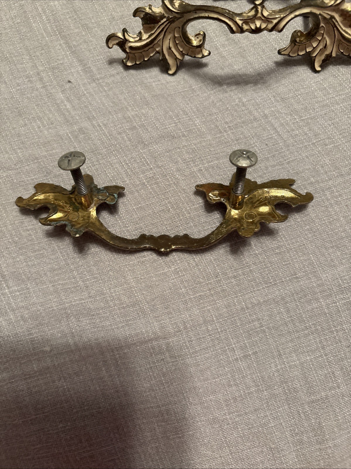 β οΈ NOTE TO BUYERS These are authentic vintage hardware pieces, not modern big-box reproductions. Patina and minor imperfections are part of their character and value. π DETAILS β’ Quantity: Set of 4 β’ Material: Cast brass or brass-plated metal β’ Finish: Original antique patina (not polished) β’ Style: Rococo / Victorian / French Revival β’ Era: Late 1800sβmid 1900βs β’ Condition: Very good antique condition Light wear, oxidation, and age-appropriate surface marks. No cracks or breaks noted. Beautiful set of four matching antique drawer pulls featuring classic Rococo / French Revival scrollwork. These are solid, weighty pieces with original aged patina β *one has slight chalk paint or oxidation. Stamped factory pattern numbers on the reverse (K9703 / KRC), which is typical for period furniture hardware and does not indicate a modern reproduction. Perfect for restoring or upgrading: β’ Dresser β’ Buffet or sideboard β’ Vanity β’ Antique cabinet or chest