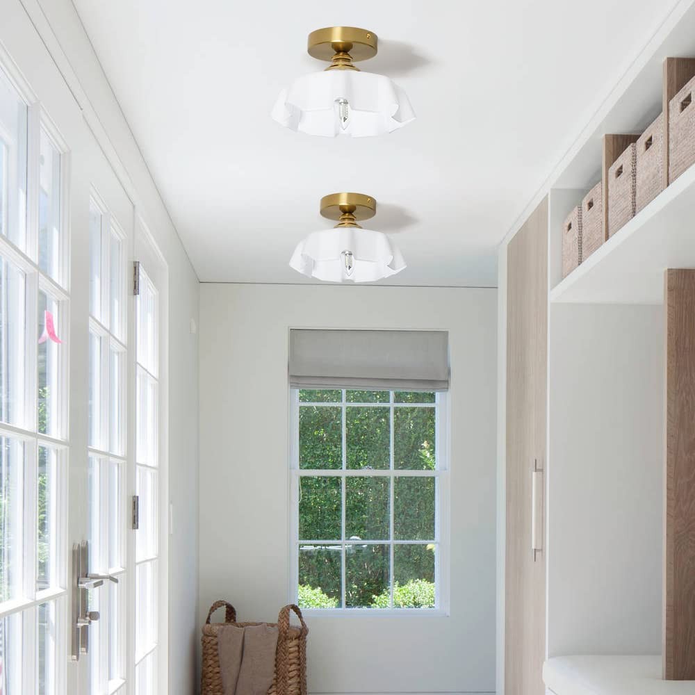 Golden Flower Glass Shade Ceiling Light with E12 Bulb - Elegant Decor for Small Spaces ✨ Transform Your Space with Artistic Lighting Introducing our Golden Flower Glass Shade Ceiling Light, a stunning blend of elegance and functionality. Designed with a vibrant golden flower-shaped glass罩 (31.8 cm diameter), this lamp combines modern aesthetics with warm, ambient illumination, perfect for enhancing the ambiance of small spaces like bedrooms, corridors, bathrooms, or cozy reading nooks 210. Key Features Elegant Floral Design Inspired by nature, the handcrafted glass罩 features delicate golden flower patterns that diffuse light evenly, creating a soft, romantic glow. The glass material ensures superior light transmission while adding a touch of luxury to your decor 49. E12 Bulb Compatibility Fits standard E12 candelabra screw-base bulbs (sold separately), ideal for energy-efficient LED options. Choose from warm white (3000K) or cool white (6000K) bulbs to match your mood and space 58. Compact & Space-Saving Ultra-thin profile (7.5 cm height) and lightweight design make it ideal for tight spaces without compromising on brightness. Perfect for apartments, dorm rooms, or minimalist interiors 614. Durable & Easy to Install Crafted from high-quality borosilicate glass (resistant to thermal shock) and reinforced metal frame, this lamp withstands daily use. Includes all necessary mounting hardware for hassle-free installation 1016. Energy-Efficient LED Ready Pair with LED E12 bulbs (e.g., 18W equivalent to 100W incandescent) for 50% energy savings and a longer lifespan (up to 50,000 hours). Eco-friendly and cost-effective 58. Perfect for Small Rooms: Bathrooms, closets, hallways, or kitchen islands. Decorative Lighting: Add a touch of sophistication to modern, bohemian, or vintage-themed spaces. Gift Idea: A unique present for housewarmings, weddings, or holidays 24. Why Choose Us? -Certified Quality: Meets safety standards for reliable performance. Upgrade your lighting with this golden floral ceiling lamp—where beauty meets practicality! 🌸 Note: Bulb not included. We recommend 3000K-4000K LED E12 bulbs for optimal results. 【Vintage Ceiling Light】The glass shade of this industrial flush mount ceiling light is treated with a thickened finish. The brass base is thick and sturdy and the surface is treated to resist rust and corrosion. The ceiling light fixture has a soft and comfortable brightness that won't hurt your eyes. The glass flush mount ceiling light will last and maintain its appearance for a long time 【Easy to Install & Widely Use】The gold flush mount light is easy to install with included instructions and hardware. It's DIY design, the detailed installation instructions will guide you on how to install it quickly, perfect for staircase corridor foyer entrance walkway stairwell aisle beside 【Bulb Requirements】 Compatible with 60-watt max E12 based bulbs, including LED, CFL, and Edison bulbs (bulb not included). You can choose from different styles of bulbs and colour temperatures, allowing you to easily create a variety of atmospheres in your home. 【Unique Design】This semi flush mount ceiling light consists of a unique white glass shade, design inspired by blooming flowers. The brass gold base with added knurled design elements to add a modern farmhouse style, this cute small ceiling light can bring a soft and comfortable pleasant feeling to a home space. 【Sincere Service】 DSMJFU is a company that focuses on ceiling lamps and lanterns and belongs to the field of advanced lamps, no matter what problems we have with our glass flush mount ceiling lights, we hope you will us, we hope to make you satisfied with this purchase through our best after-sales support, we will sincerely solve your problems within 24 hours.