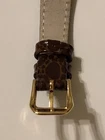 Crafted with the finesse that Breitling is renowned for, this Cadette women's wristwatch is a testament to classic Swiss craftsmanship. The timepiece features a golden dial adorned with the iconic Breitling logo and complemented by a harmonious blend of gold and silver tones in the case. With its 27mm gold-filled case and a durable stainless steel band, this watch is designed to suit any wrist size, ensuring a comfortable and secure fit. The watch houses a reliable mechanical (manual) movement with 17 jewels, guaranteeing precision and a touch of luxury to your daily ensemble. Despite its vintage status, this piece remains a chic accessory for both casual and formal occasions, embracing a range of styles from classic to contemporary. Note that this item is offered as is, with the understanding that it doesn’t currently run and will need servicing.