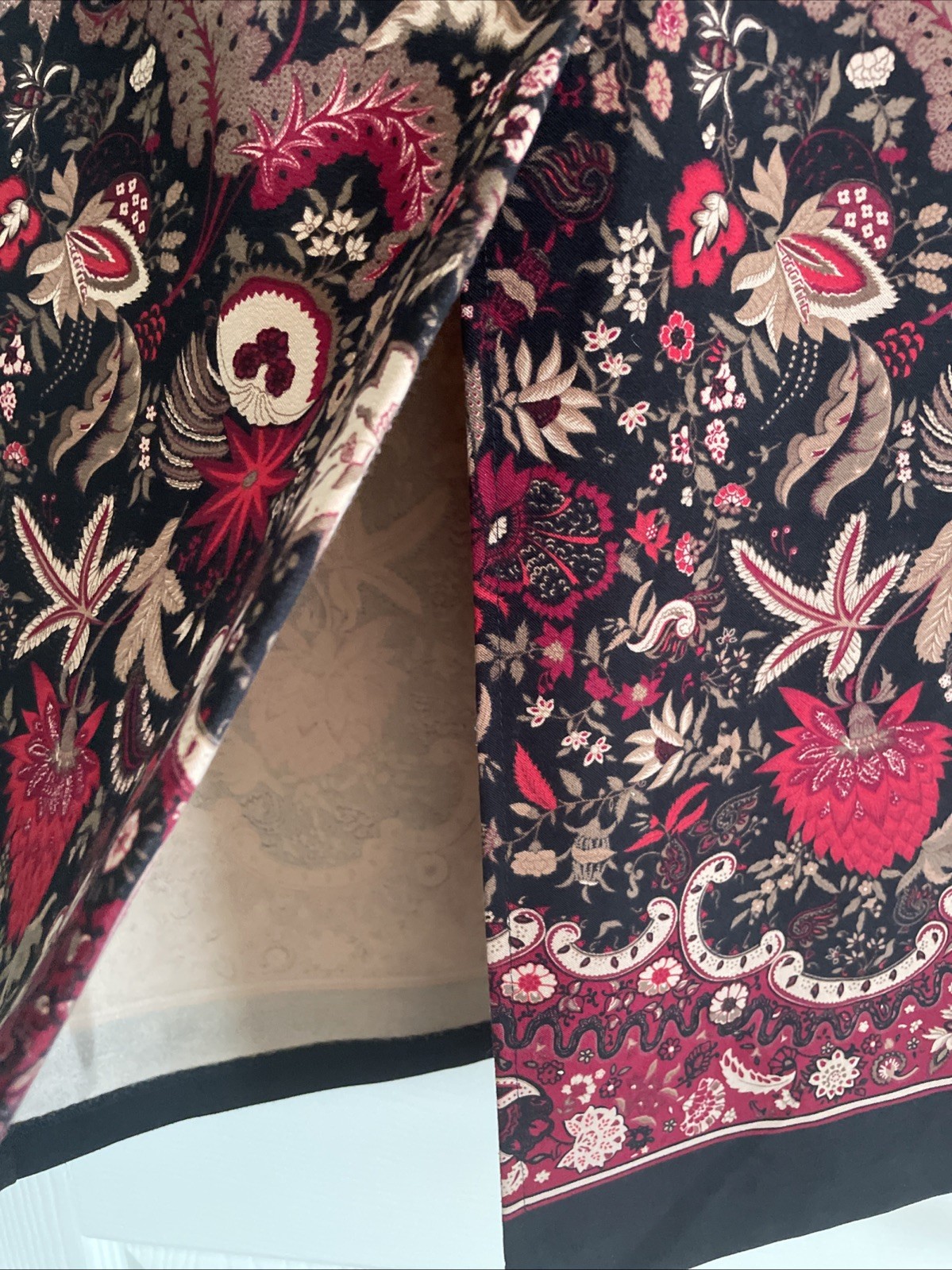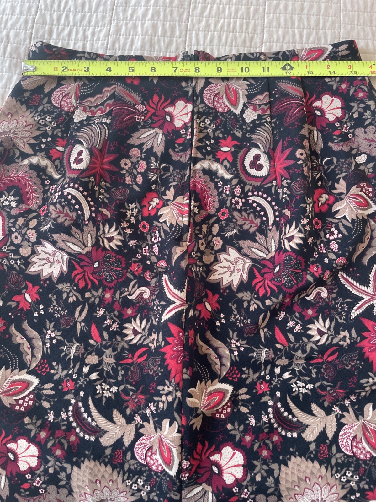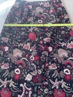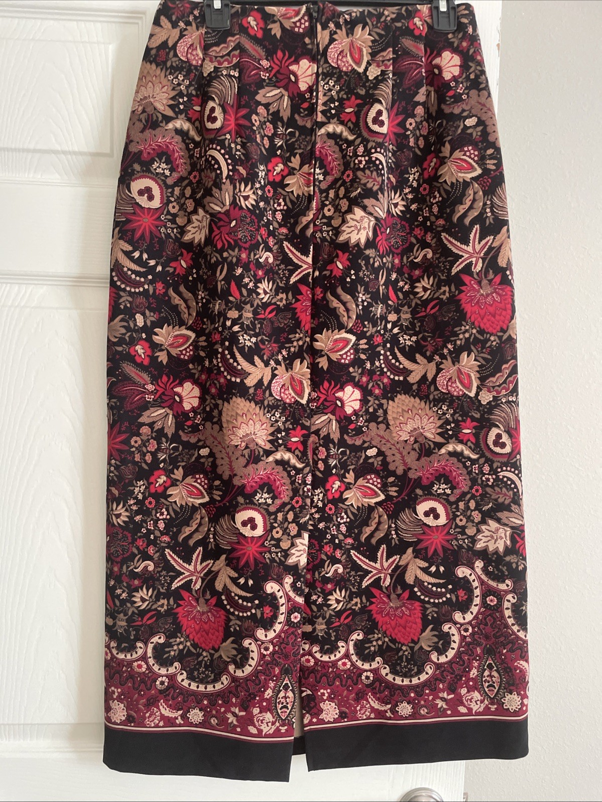 The Vintage Briggs New York long pencil skirt in size 12 features a velvety soft touch fabric with a floral pattern in black, burgundy, beige, and cream colors. The skirt has a high rise and a straight and pencil style, making it suitable for various occasions such as travel, parties, casual wear, and business meetings. It is easy to care for as it is machine washable, and includes accents like a zipper closure and a back slit. Made from a blend of polyester and spandex, this skirt is perfect for all seasons and offers a stylish and versatile addition to any woman's wardrobe. Excellent preloved condition, like new.