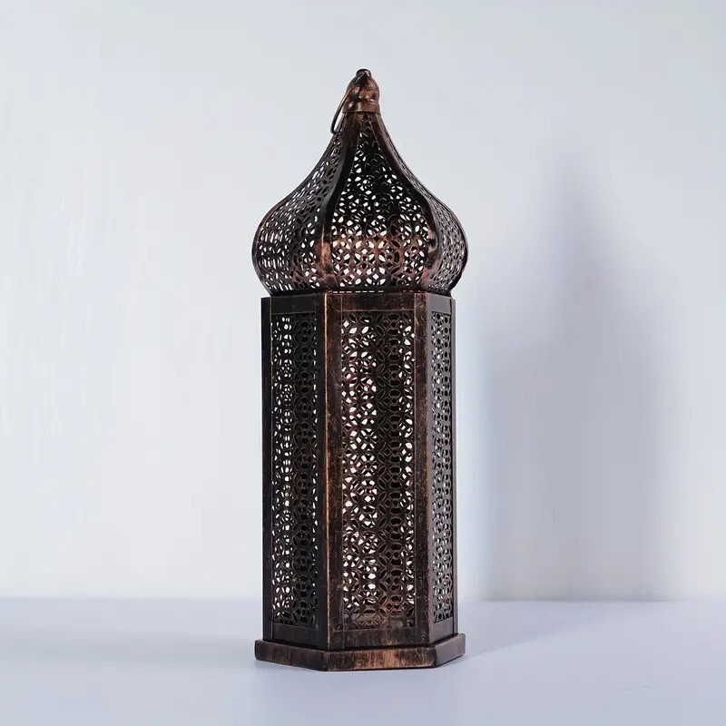 Vintage Moroccan LED Lantern is a beautifully crafted decorative lamp designed to add a touch of rustic charm to any space. This lantern is made from high-quality metal and features an intricate filigree design that casts a warm, inviting glow when lit. The detailed craftsmanship creates a stunning pattern of light and shadows on the surrounding surfaces, enhancing the ambiance of your home, office, or tabletop. The lantern has a hexagonal base and a domed top with a loop for hanging. The dimensions of the large lantern are approximately 13.91 inches (33.5cm) in height, 4.764 inches (12.1 cm) in width, and 4.764 inches (12.1 cm) in depth (Batteries Not Included).