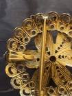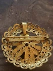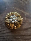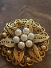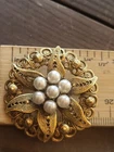 This vintage brooch features a Victorian filigree design with a round cream-colored imitation pearl as the main stone. The brooch is made of yellow gold plated metal and can also be worn as a pendant. It exudes a sense of beauty and love, perfect for adding a touch of vintage charm to any outfit.