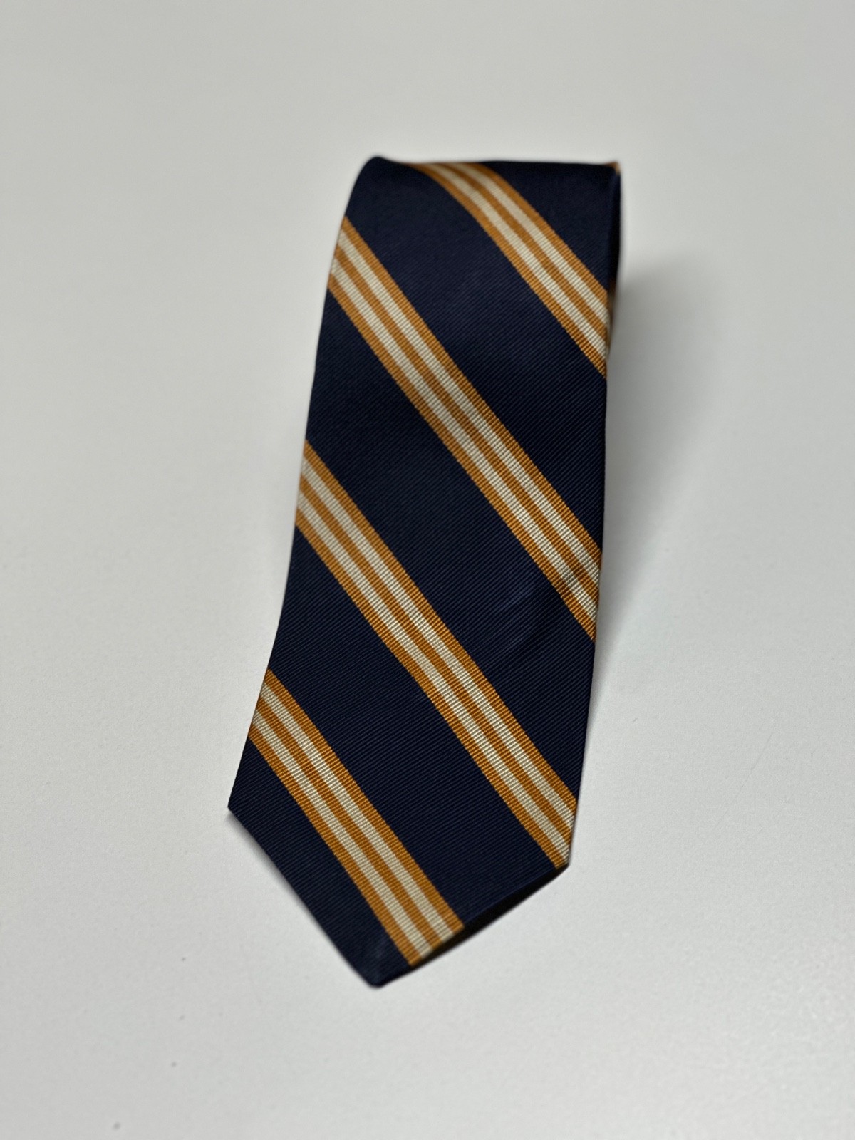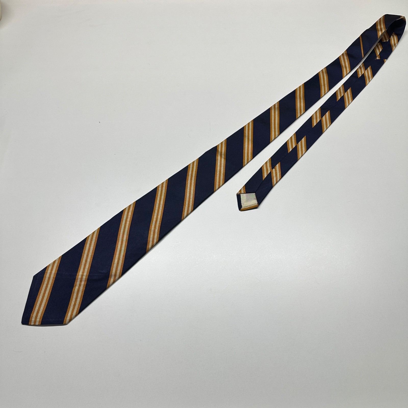 Vintage Brooks Brothers Makers Tie All Silk Striped Blue Gold 3.25 x 56 Repp UK Fabric Measures: 3.25 x 56 inches (aprox). Color: Blue Gold Pattern: Striped Material: Silk Comments: General wear from use. No damage found. Lined. The Vintage Brooks Brothers Makers Tie is a classic piece made from 100% silk in a striped blue and gold design. With a classic length of 3.25 inches and a width of 56 inches, this tie exudes a preppy style perfect for any man's wardrobe. Made in the United States by the reputable brand Brooks Brothers, this tie is a timeless accessory that adds a touch of sophistication to any outfit.
