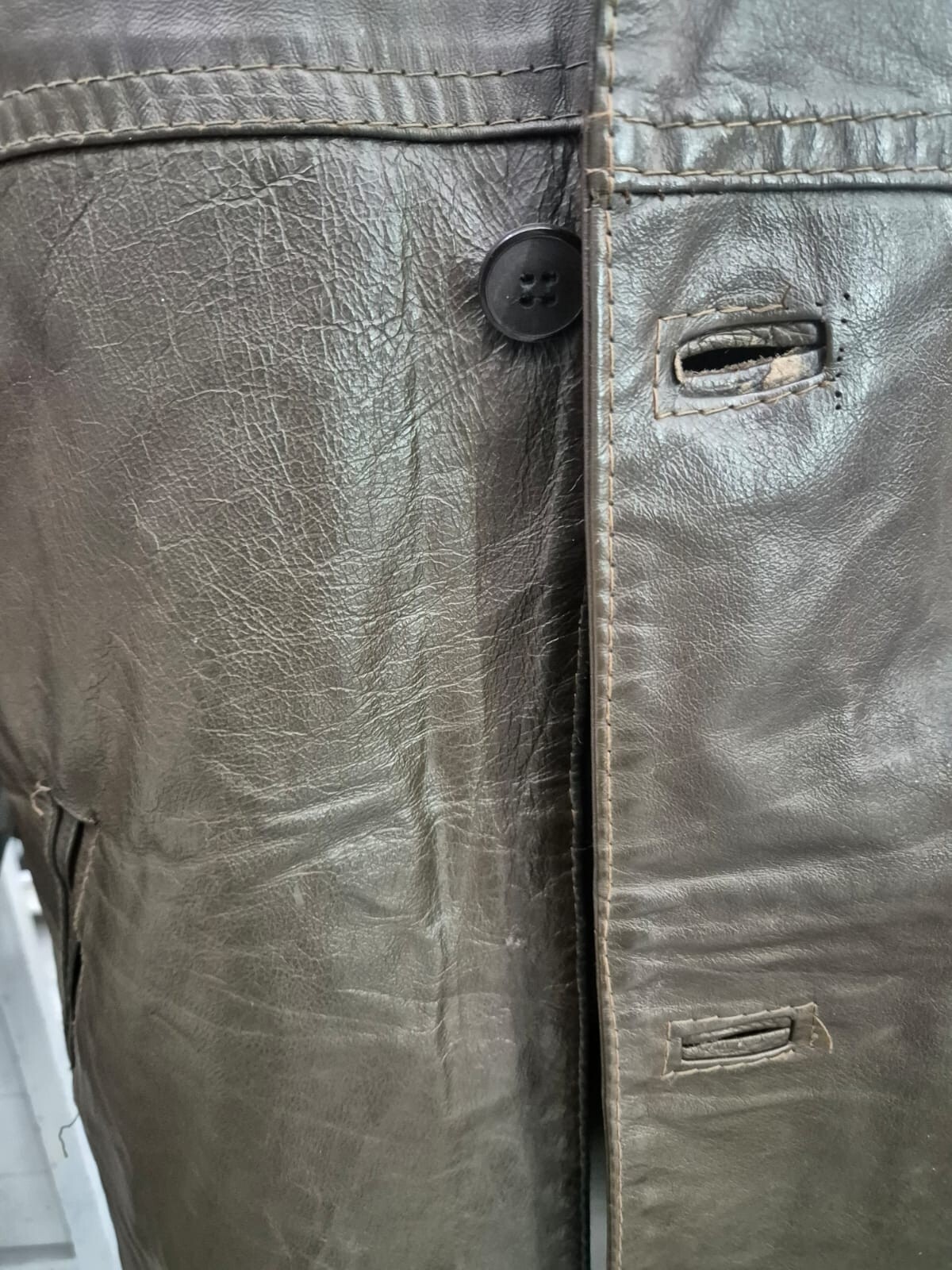 Color:BrownBrand:UnbrandedClosure:ButtonOuter Shell Material:LeatherVintage:YesStyle:JacketDepartment:mangtin13:Does not applySize:SSize Type:RegularType:Jacketmaterial texture:leatherUPC:Does not apply