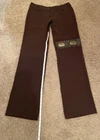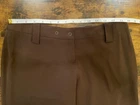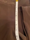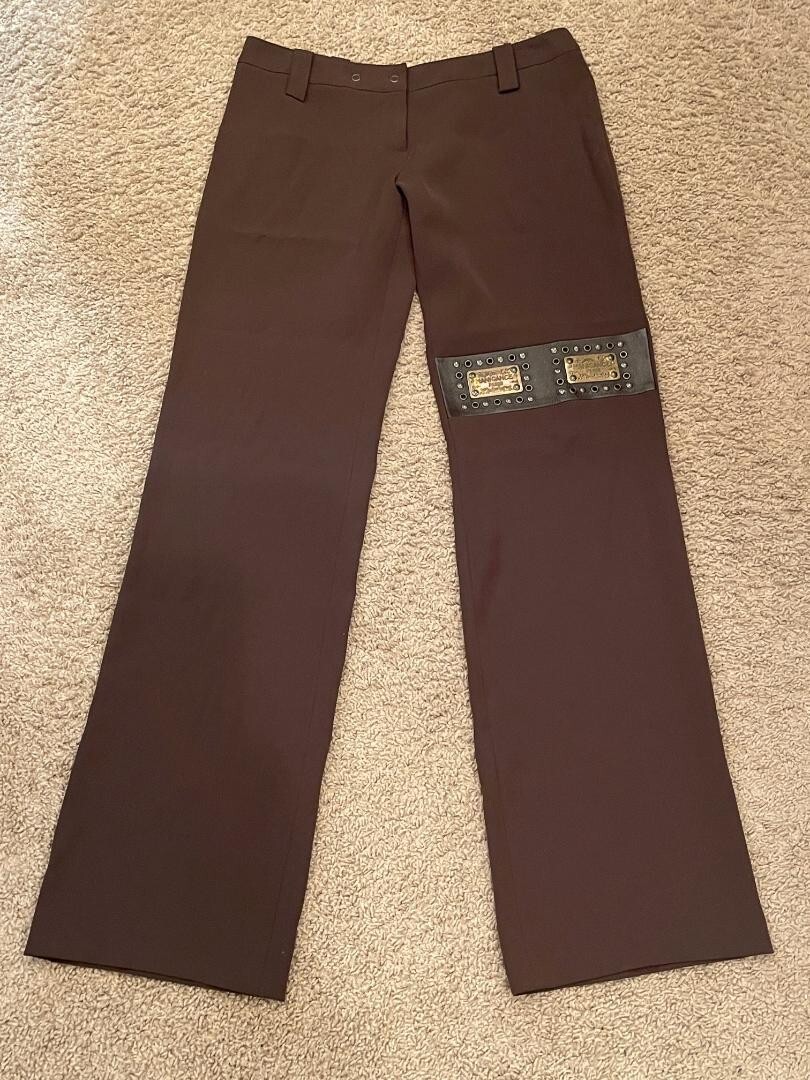 Elevate your wardrobe with these sophisticated Manigance Paris vintage women's pants, a timeless addition for those who appreciate a blend of classic style with modern accents. In a rich brown hue, these dress pants feature a wide-leg silhouette that offers both comfort and elegance. The design includes a unique leather logo across the thigh, complemented by bronze studs and rivets that add a touch of edgy charm. Constructed with high-quality polyester and designed to cater to a regular fit, these pants are versatile for various occasions, ranging from business meetings to casual outings, or even cocktail parties. With a convenient snap and zip closure, a flat front, and a rise that sits at 8 inches, these pants promise a flattering look for anyone who wears a size Europe 40 or a 28-inch waist. The inseam measures 32 inches, ensuring a perfect length for your next event.