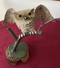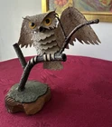 Elevate your space with a touch of MCM brutalist artistry through this striking owl sculpture. The piece, rendered in metal with a handsome wood base, stands 19 inches tall and is a testament to the sleek, three-dimensional design of the 1980s. Featuring a distinctive style that nods to Kokojawa culture, this large sculpture is a limited edition work that's both handcrafted and signed by the artist, ensuring its authenticity and uniqueness. Its robust metalwork production technique highlights the sculpture's quality, making it an original piece from the period between 1980-1989. The sculpture's brutalist format gives it a timeless appeal, seamlessly blending with a variety of decor themes and styles. This owl's sophisticated presence is a perfect statement piece for collectors and enthusiasts alike. Owl measures 15x13 in. and weighs 5-1/2 lbs.