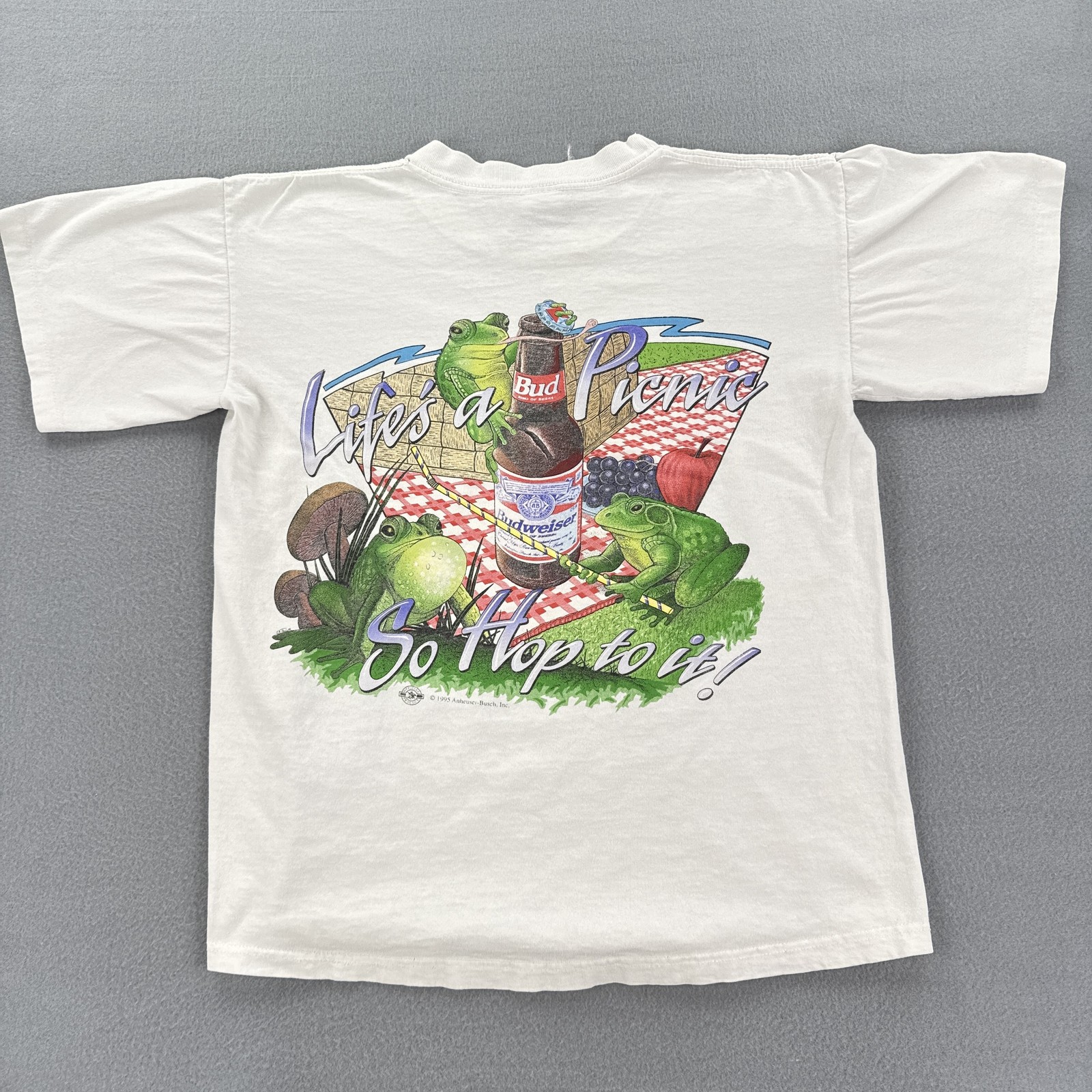 Vintage Budweiser Shirt Mens Medium White 90s Frogs Picnic Beer Tee 1995 Made USA Condition: Good pre-owned vintage condition with light wear and visible light stains on the lower front, shown in photos. Official Budweiser shirt featuring the iconic 1990s Budweiser frogs picnic graphic on back with "Life's a Picnic, So Hop to It!" slogan. Dated 1995 Anheuser-Busch, Inc. Front features Budweiser frog graphic over "Budweiser King of Beers" logo at chest. Tag: H.L. Miller Total Tee, 100% Cotton, Pre-Shrunk, Made in USA, Medium Classic 90s boxy fit, single stitch hem sleeves and bottom (true vintage) Main color: White with multicolor frog and picnic scene graphic print Approximate flat measurements shown in photos: 19.5" pit to pit, 27.5" collar to hem Great piece of vintage 90s Budweiser and advertising memorabilia