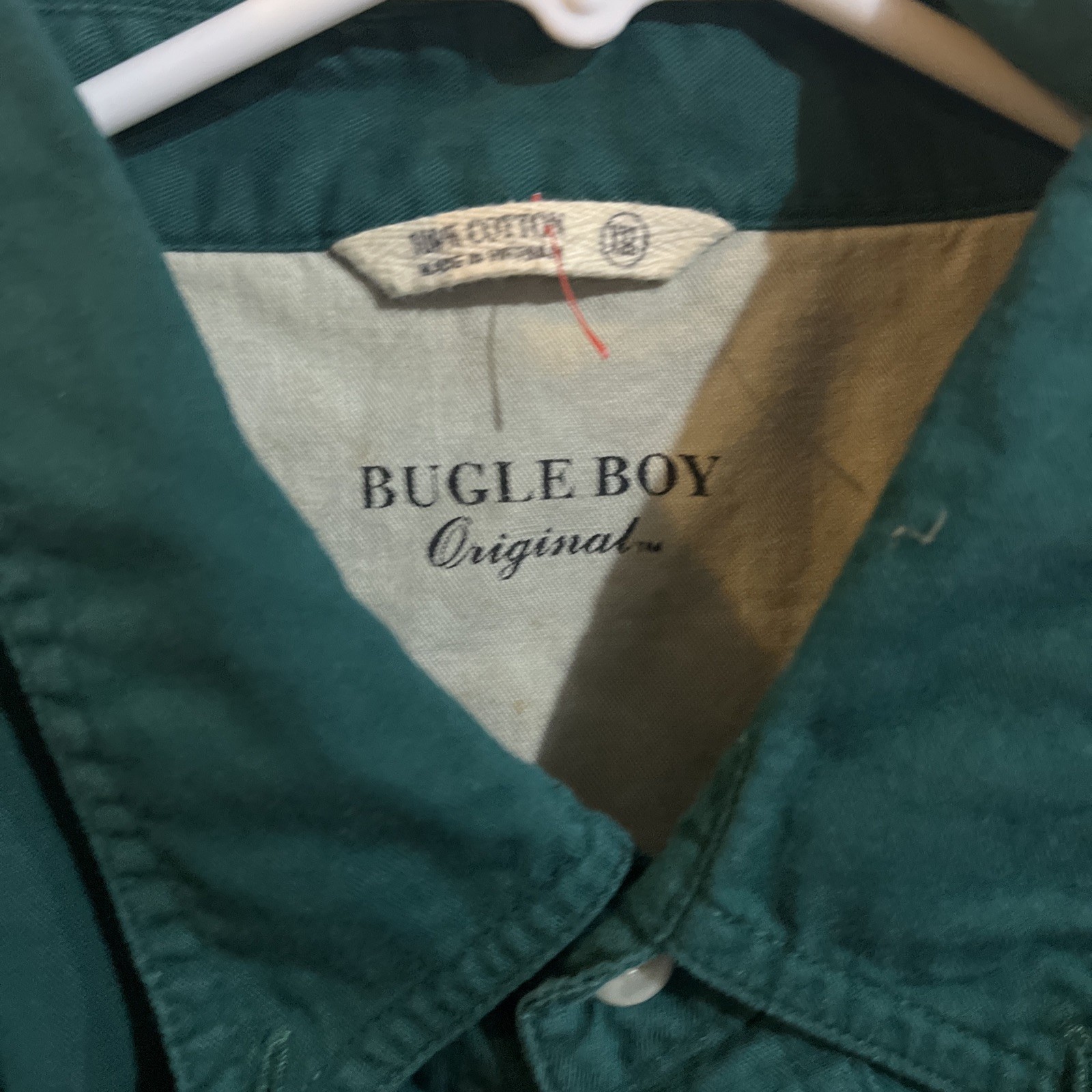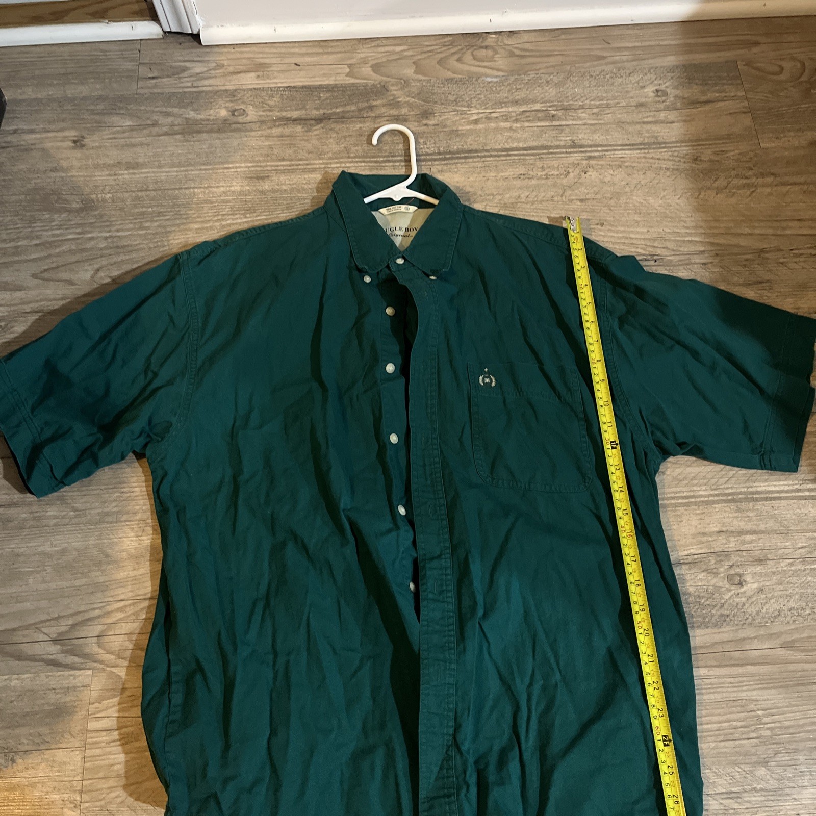The Vintage Bugle Boy Short Sleeve Button Up Shirt in green, size large, is a classic addition to any man's wardrobe. Made from comfortable cotton material, this collared shirt features a solid pattern and button closure, perfect for a casual occasion in the summer, fall, or spring season. With its retro charm and reliable machine washable care instructions, this shirt by Bugle Boy Company is a timeless and versatile piece that can be styled in various ways for a stylish look.