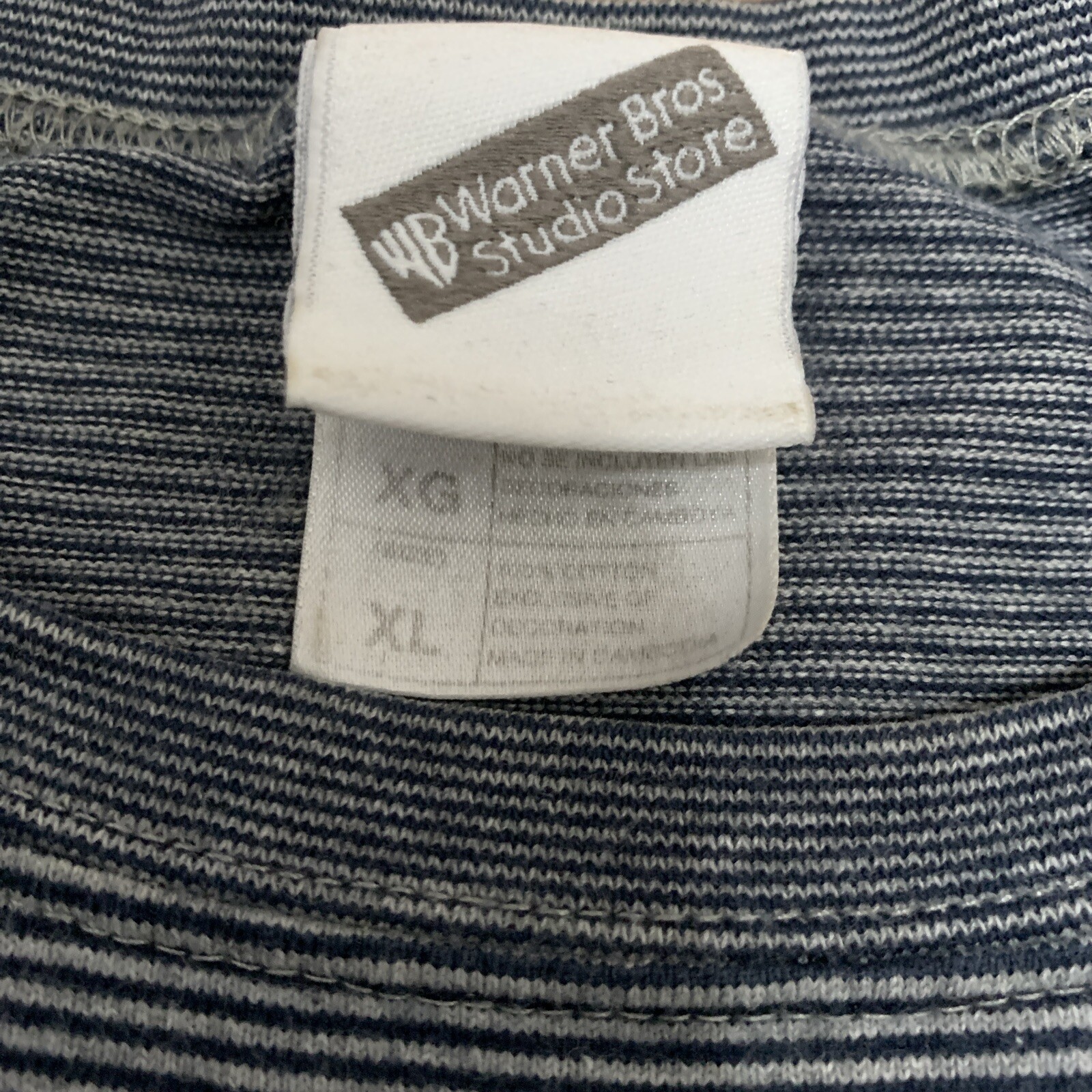 This is a vintage Warner Bros Bugs Bunny T-shirt in size XL. The shirt features a striped pattern in blue with an embroidered Looney Tunes design. It is a men's regular fit shirt, showcasing the iconic Bugs Bunny character from the beloved Warner Bros animated series.