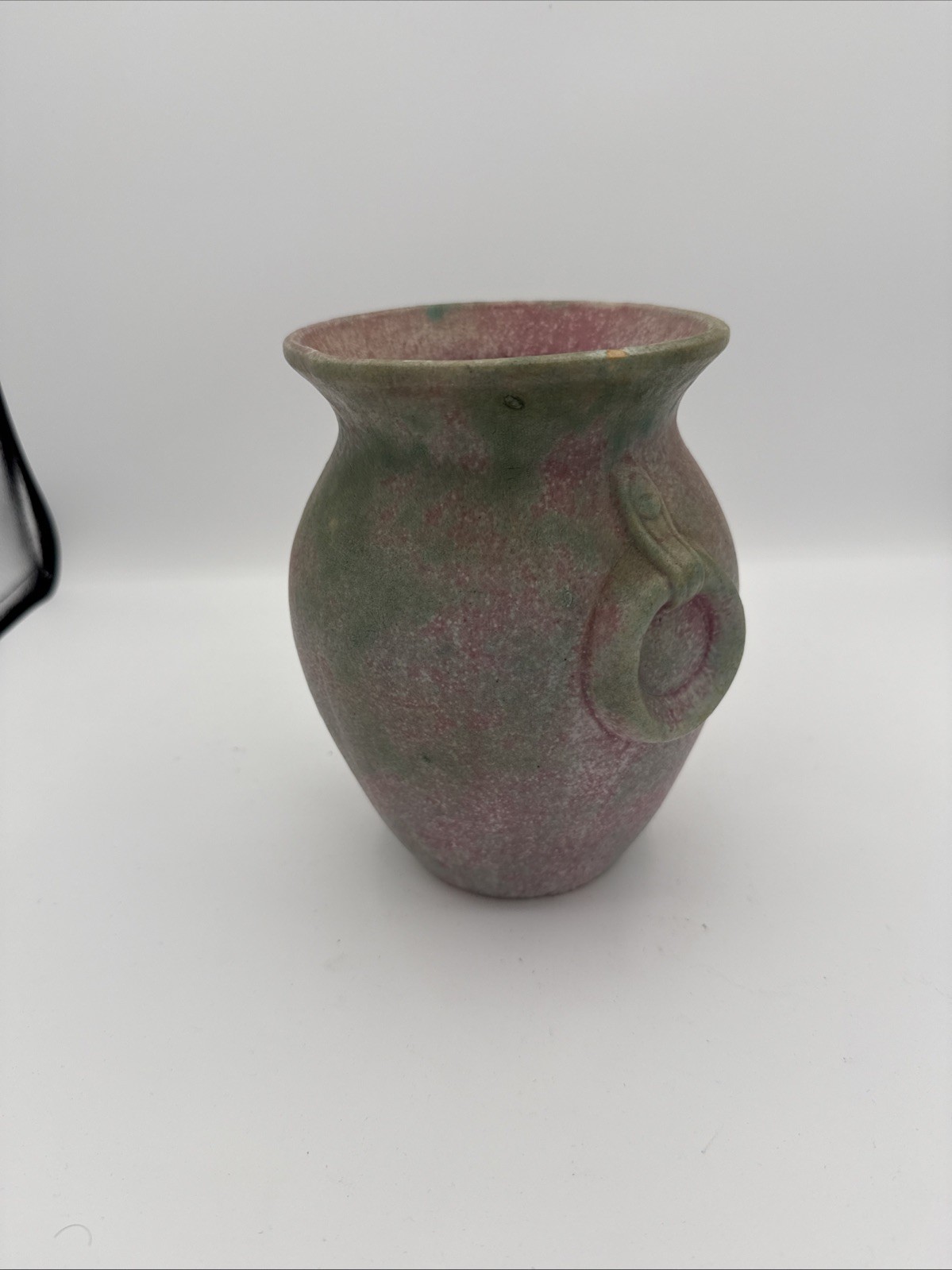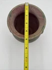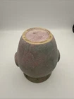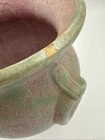 The product is a 6 3/4" Burley Winter #53 Arts and Crafts pottery vase with rings, featuring a pink and green color scheme. This vintage piece from the early 20th century is an original example of Arts & Crafts/Mission style pottery. The vase is made of clay using pottery techniques and bears an impressed backstamp, making it a unique and collectible item for those interested in decorative pottery and glassware from the Arts & Crafts era. Almost 7”- see photos for measurements. * please note a small older paint chip on rim