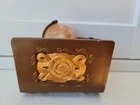 Vintage Business Card Holder – Old World Academic Book Globe Ink Bottle Small mark on the back top that can be seen in photo. Can be hidden with concealing marker or tiny amount of putty. Original photos were taken in the evening and are under lamp/overhead light. The last 2 photos are in bright light with very direct sun. Every screen will display colours a bit differently, so I have tried to photograph it with different kinds of light.