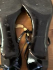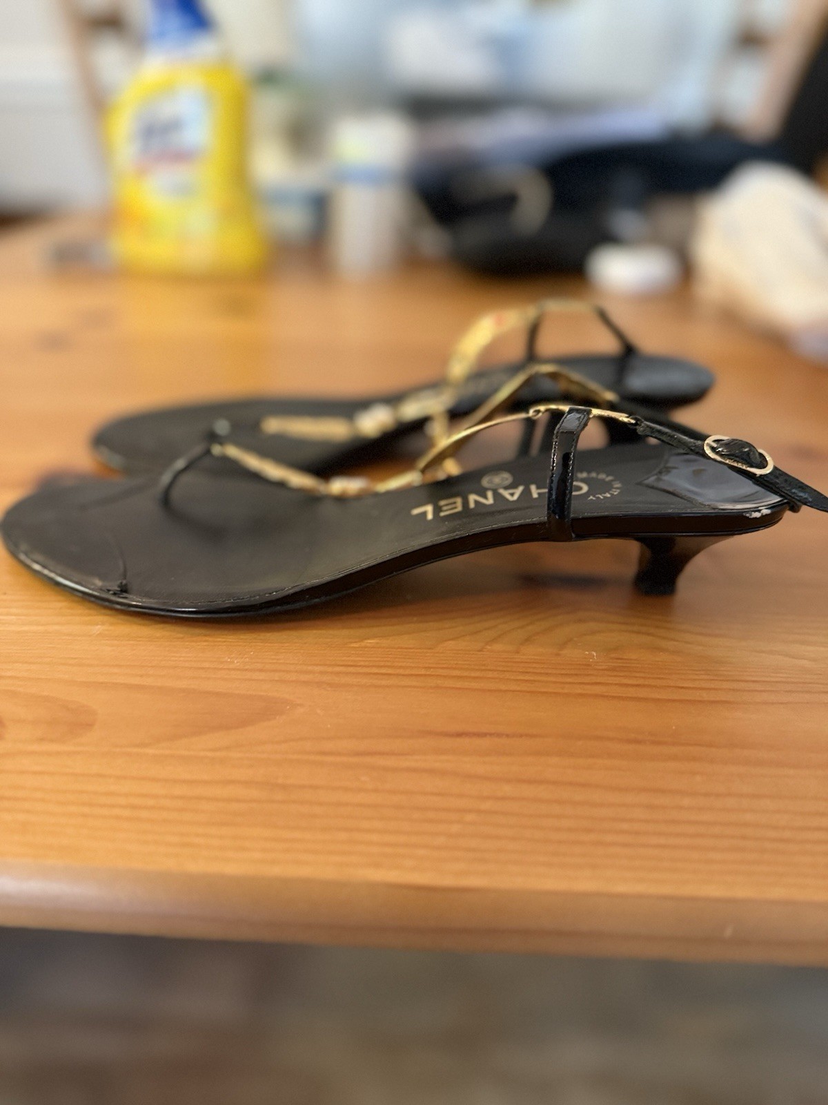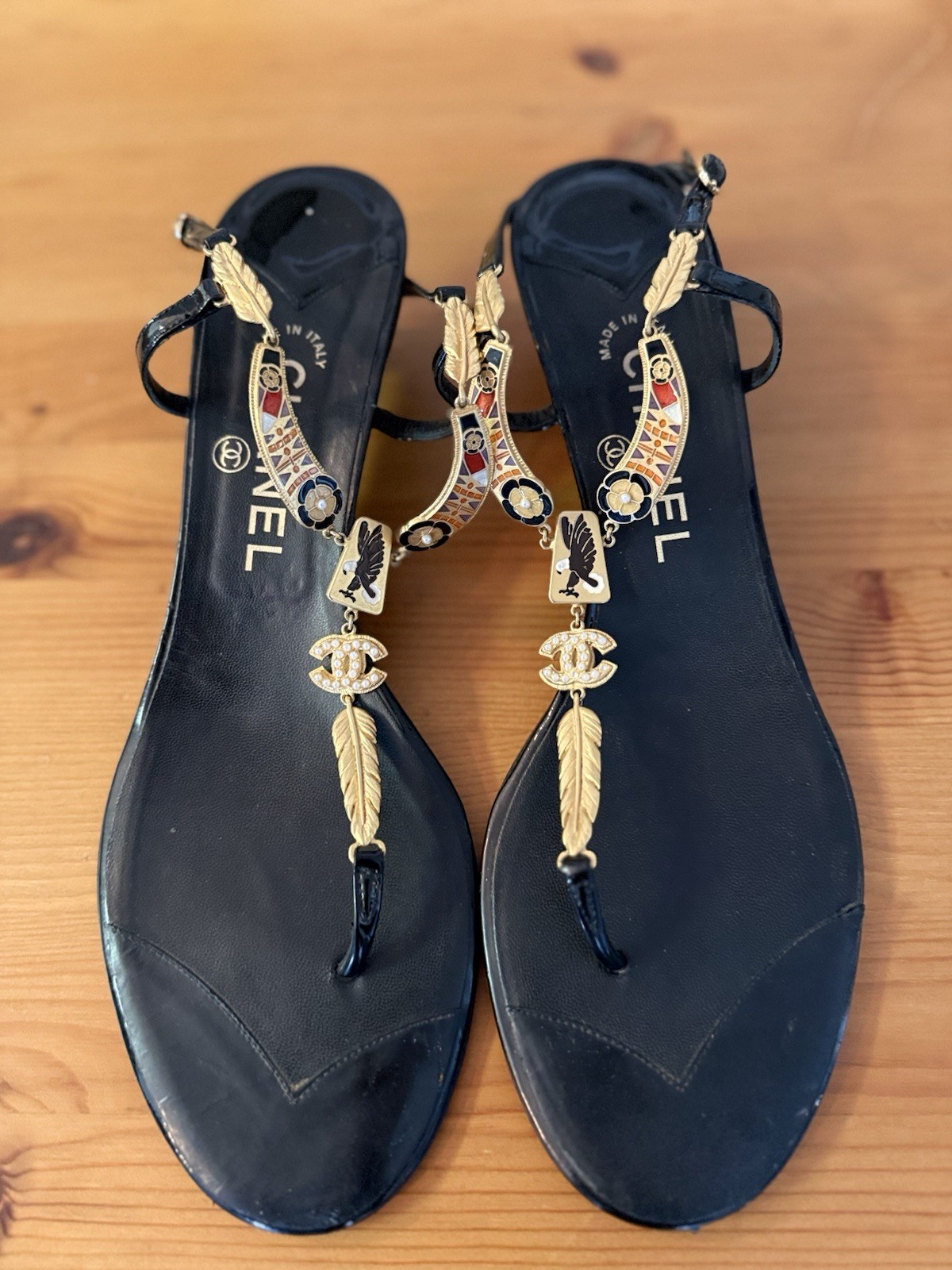 These vintage CHANEL sandals are a stunning pair of black heels featuring a jeweled eagle design with pearls and feathers accents. The ankle strap buckle closure adds a touch of elegance, while the kitten heel provides a comfortable yet stylish option for women who are fashion-forward. Made with patent leather, these Size 41 shoes are a unique and eye-catching addition to any wardrobe, perfect for adding a touch of glamour to a casual or formal outfit.
