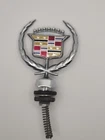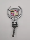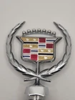 The product is a vintage Cadillac hood emblem with a spring and bracket included. It is designed specifically for use on a Cadillac vehicle, serving as an emblem on the hood. This emblem adds a classic touch to the vehicle's exterior, showcasing the Cadillac brand with a timeless design.