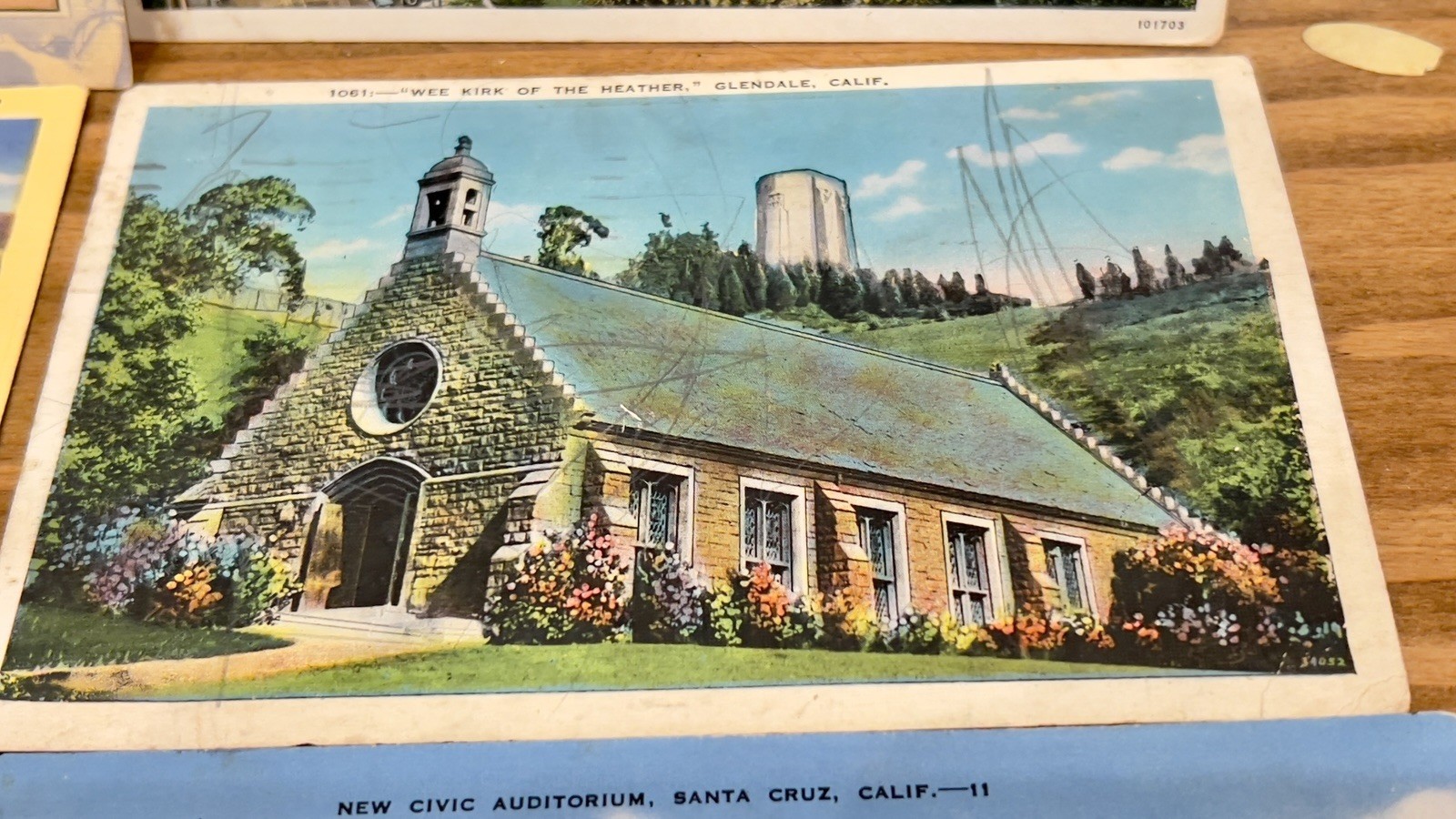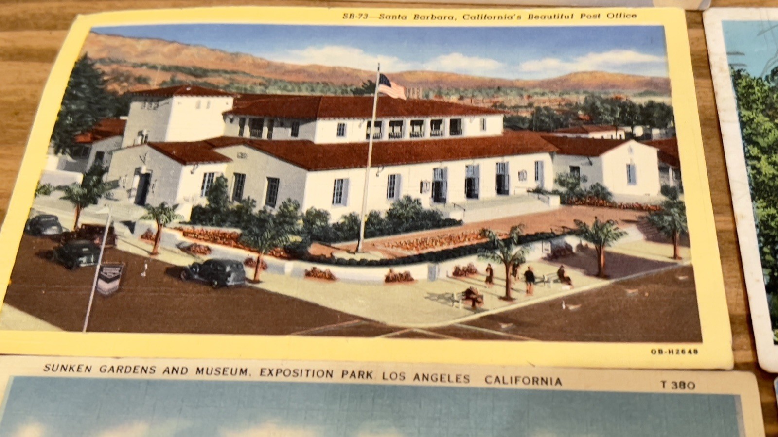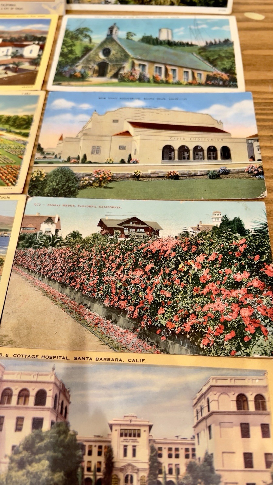 Lot of popular vintage destinations in California ; Greetings from California 1. 11. Olvera St. Los Angeles, Ca A Mexican street of yesterday in a city of today. 1944 birthplace of LA 2. SB-72 West Cabrillo Blvd. & Municipal swimming pool Santa Barbara 3. SB-6 Cottage Hospital Santa Barbara 4. Restaurants El Paseo Santa Barbara 1943 5. SB 88 Yacht Harbor and breakwater Santa Barbara 6. SB 73 Santa Barbara Post Office 7. San Diego Natural History Museum Balboa Park 81 8. Santa Cruz, Ca. Civic Auditorium 11 9. 1061 “wee Kirk of the heather” Glendale, Ca 10. LA 127 Pershing Square & South on Hill st. Los Angeles 11. 972 floral hedge Pasadena. Ca 12. T380 Sunken Gardens & Museum exposition Park, LA , Ca 1938