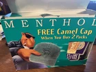 In box that it came in- minus the 2 packs of cigarettes. Hat is unworn. Camel collectible item.