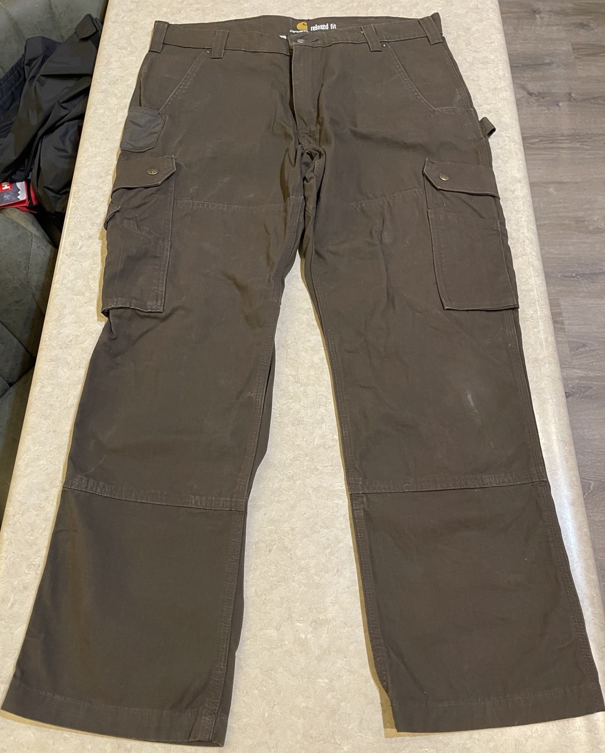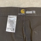 The Vintage Carhartt B342-DFE 36 X 30 Relaxed Fit Ripstop Cargo Work Pant is a durable and stylish men's workwear garment made from a cotton blend canvas fabric. Featuring a relaxed fit and straight leg style, these cargo pants are perfect for everyday work or casual wear. The brown color and logo accents add a touch of vintage flair, while the multiple pockets provide functionality and convenience. With a zip and button closure, these pants offer both comfort and easy care for the modern man. These pants are in good preowned condition with light signs of wear, please see ALL photos for a better idea on condition, any measurements, or details to the pants.