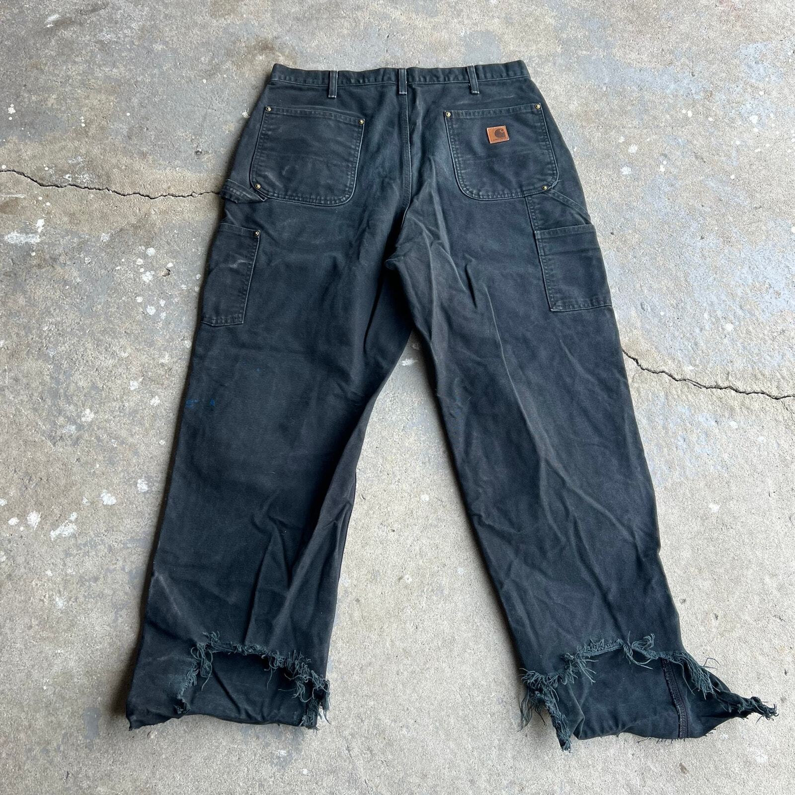 Vintage carhartt black distressed y2k double knee work wear carpenter pants. Good pair. Measure 34x29.5 and a 9.5 leg opening. Big time heel bite on these. Some paint. Please check measurements before purchasing. I do my best to show any flaws in pictures. Quick shipping! Bundles encouraged! @ants_haul on Instagram. 485!!!