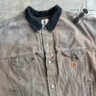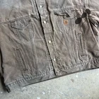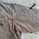 Vintage Carhartt brown lined work wear trucker jacket. Really nice jacket! Has some staining on the front and the sleeve but overall cool one. Size 3x for my larger fellas! Love yall. Measure 30.5x28.5. Please check measurements before purchasing. I do my best to show any flaws in pictures. Quick shipping! Bundles encouraged! @ants_haul on Instagram.