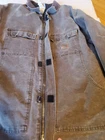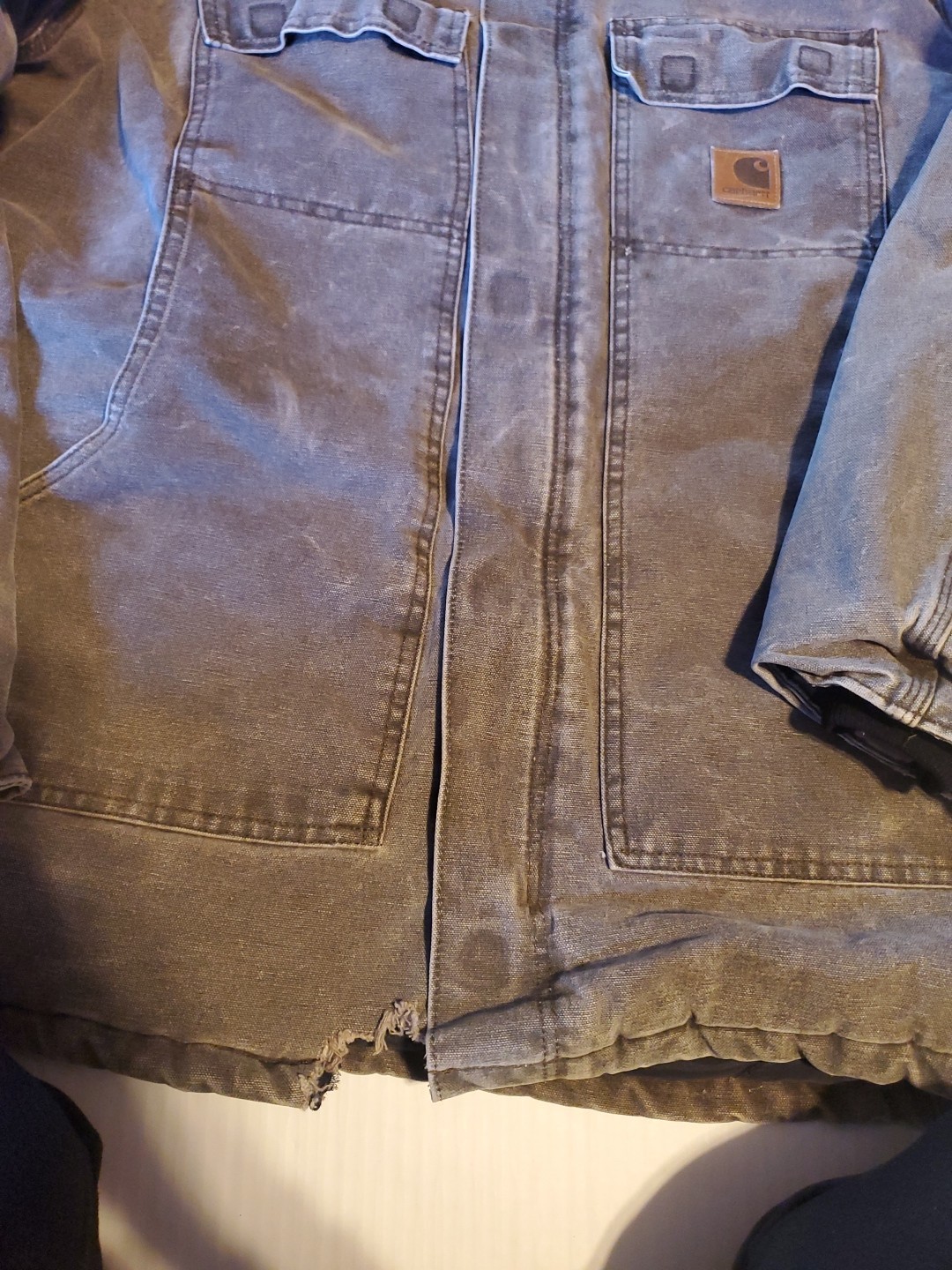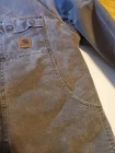 Mens Vintage Carhartt Work Jacket size XL Tall C26CHT Made in the USA grey with a brown collar full zip with Velco closure There is some distressing, so please see pictures The lining has no holes or tears shoulder to shoulder 22" armpit to armpit 26" shoulder to wrist 26" shoulder to hem 31" Fast Shipping Has been freshly Washed