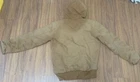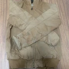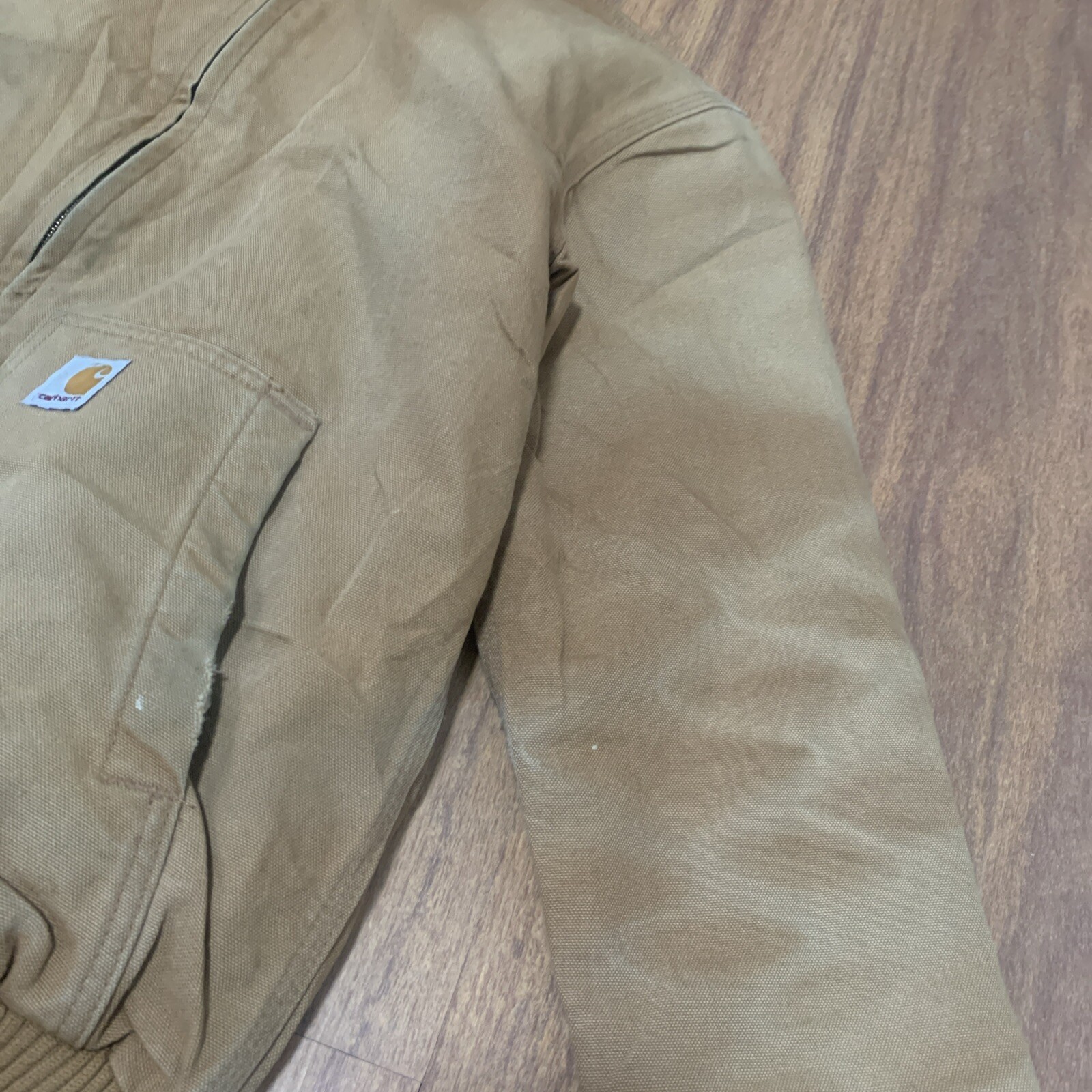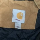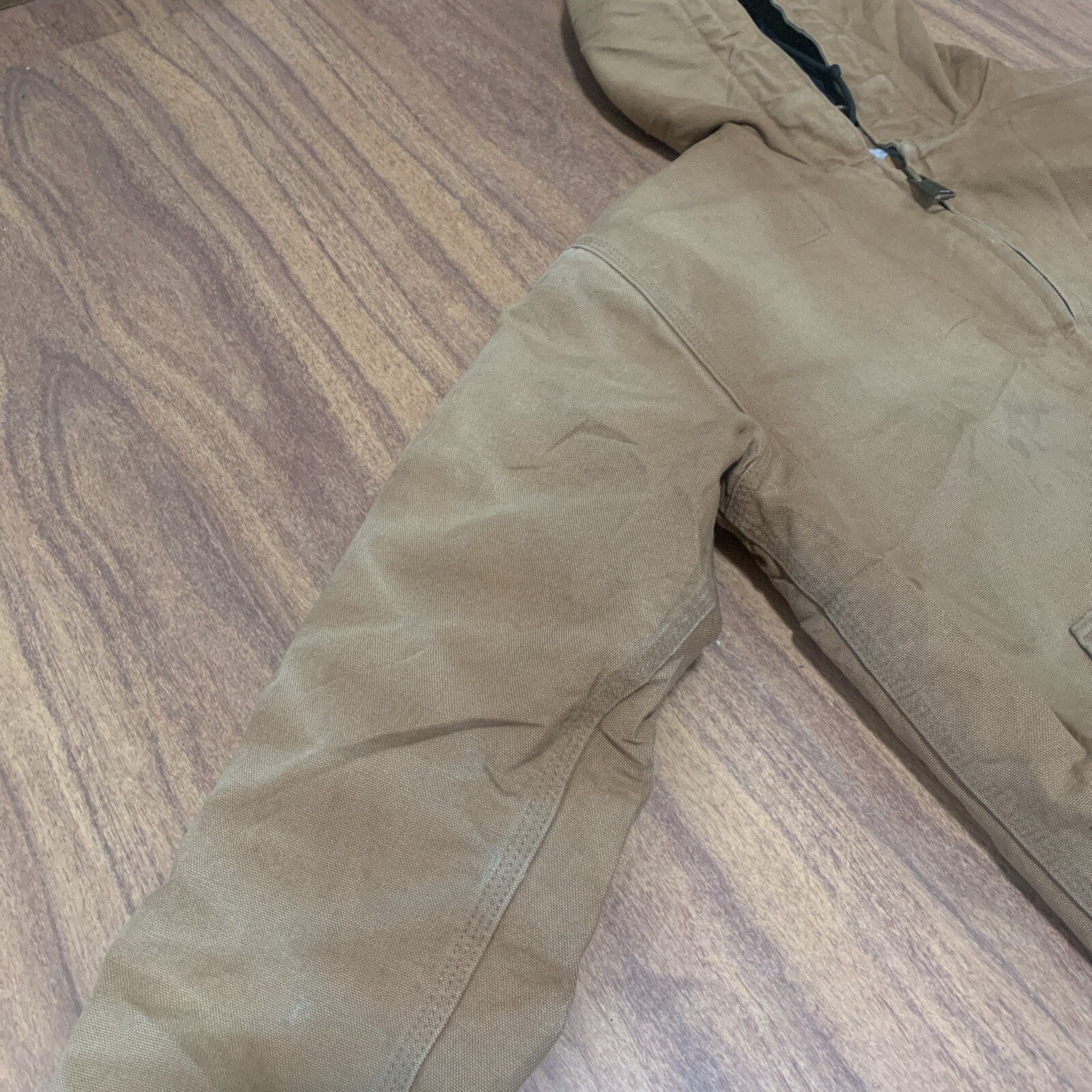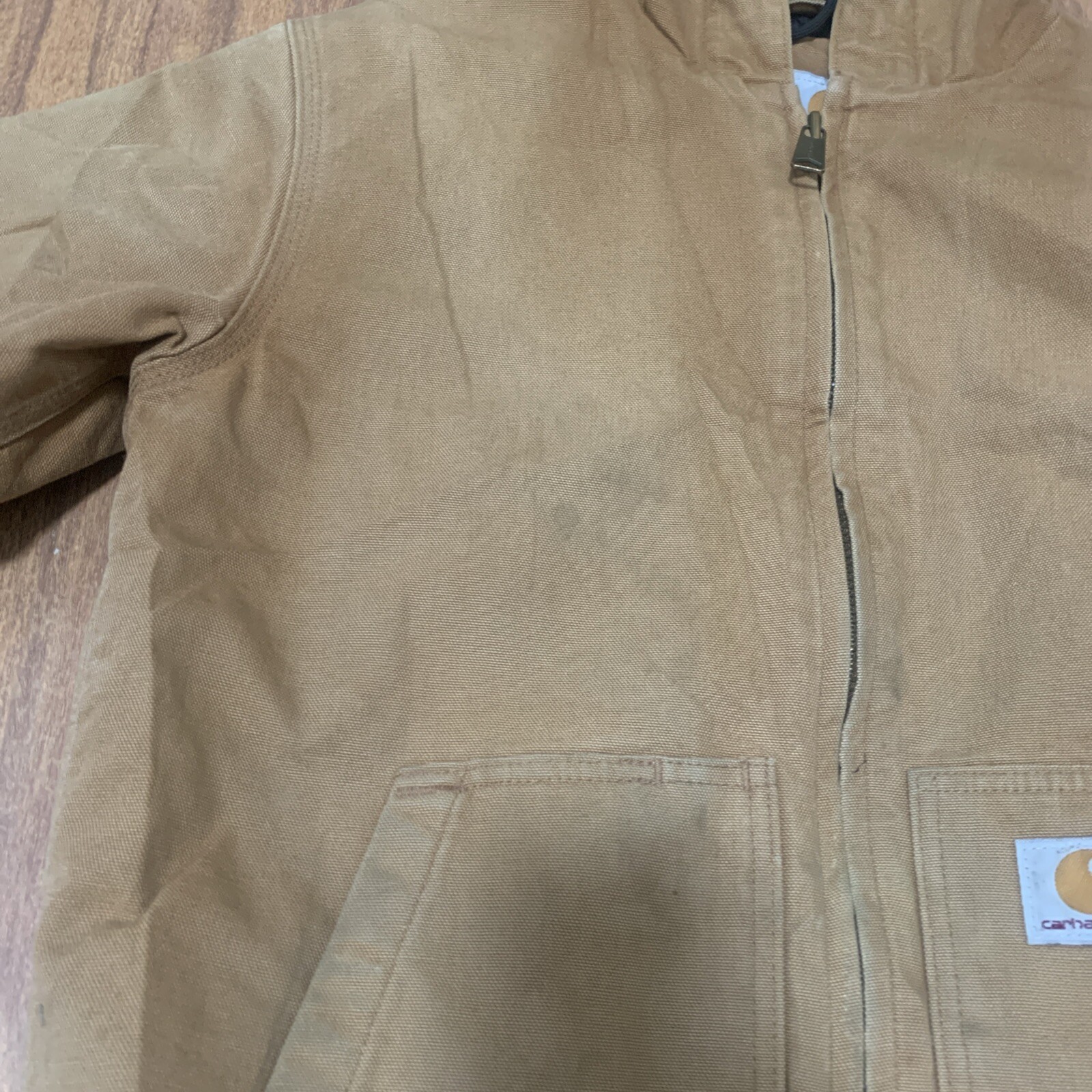This is a vintage Carhartt canvas jacket in size small, featuring a distressed hoodie design in a tan faded color. The jacket has a solid pattern, zip closure, and is suitable for workwear. Made of cotton fabric with polyester insulation, it has a regular fit and is adorned with zipper and logo accents. The jacket embodies a classic American outdoor style with influences from punk, grunge, and skater fashion of the 80s and 90s.