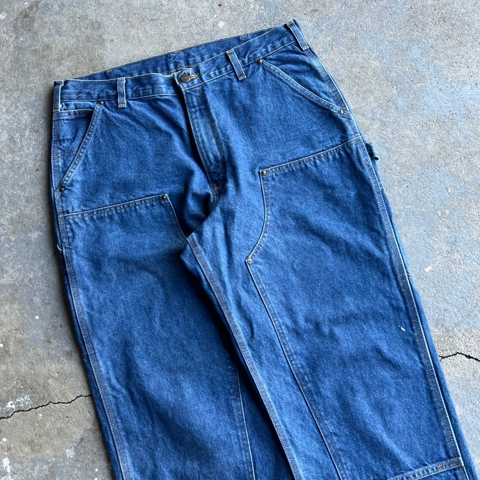 Vintage carhartt blue denim jeans double knee work wear carpenter pants. Nice pair! Measure 35x29.5 and a 9.75 leg opening. Please check measurements before purchasing. I do my best to show any flaws in pictures. Quick shipping! Bundles encouraged! @ants_haul on Instagram. 566!!!