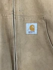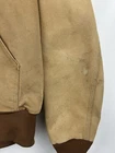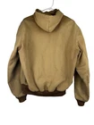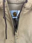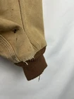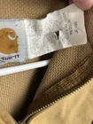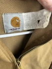Vintage Carhartt Hooded Work Jacket in brown, size medium. This bomber jacket features a cotton outer shell and polyester insulation, making it perfect for walking and workwear occasions. The jacket is hooded and has a zip closure, with accents including the Carhartt logo and a solid pattern. This jacket is ideal for fall, winter, and spring, and can be easily cared for with machine washing. The jacket is part of the Carhartt product line and is a regular fit. This USA-themed jacket is perfect for casual and workwear occasions.