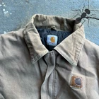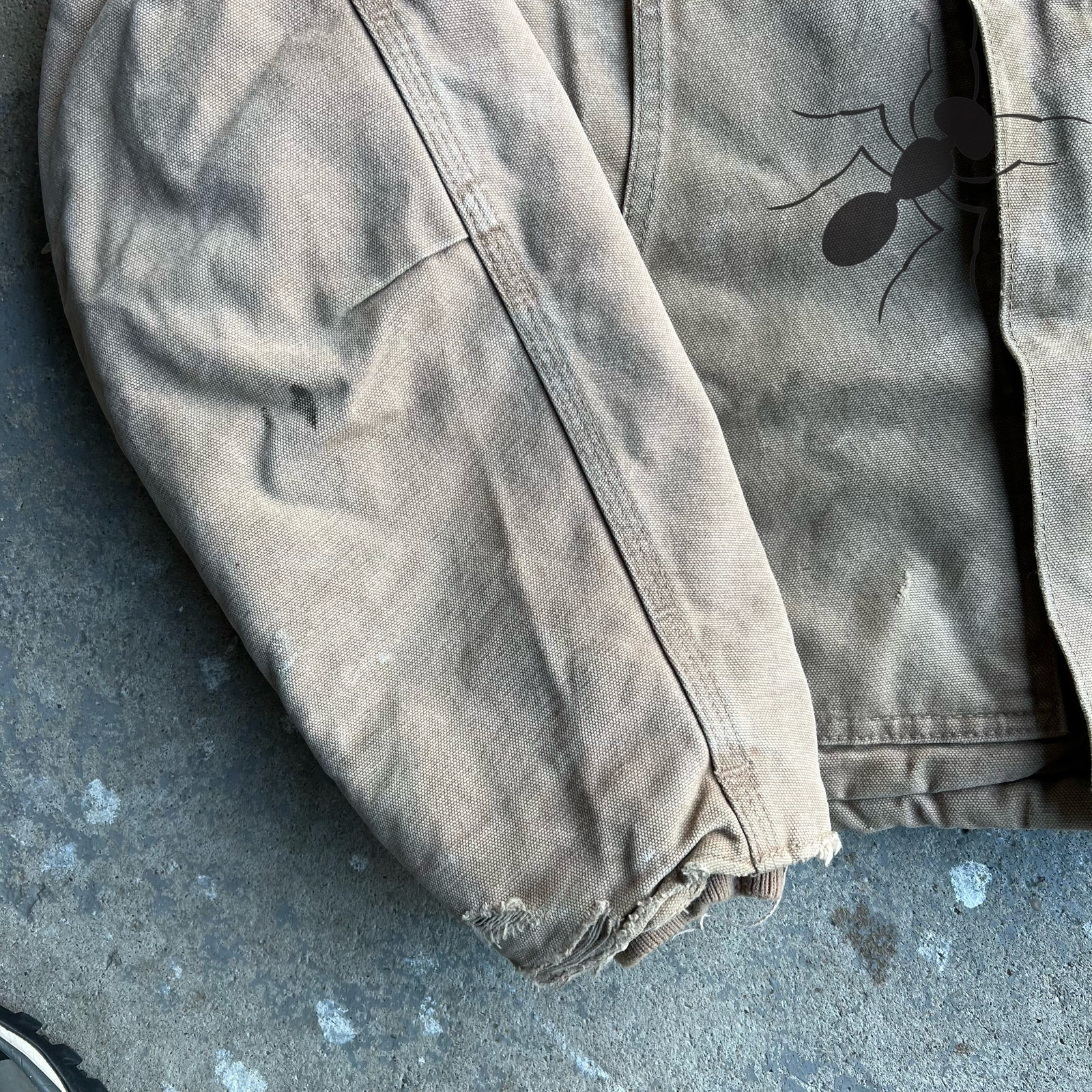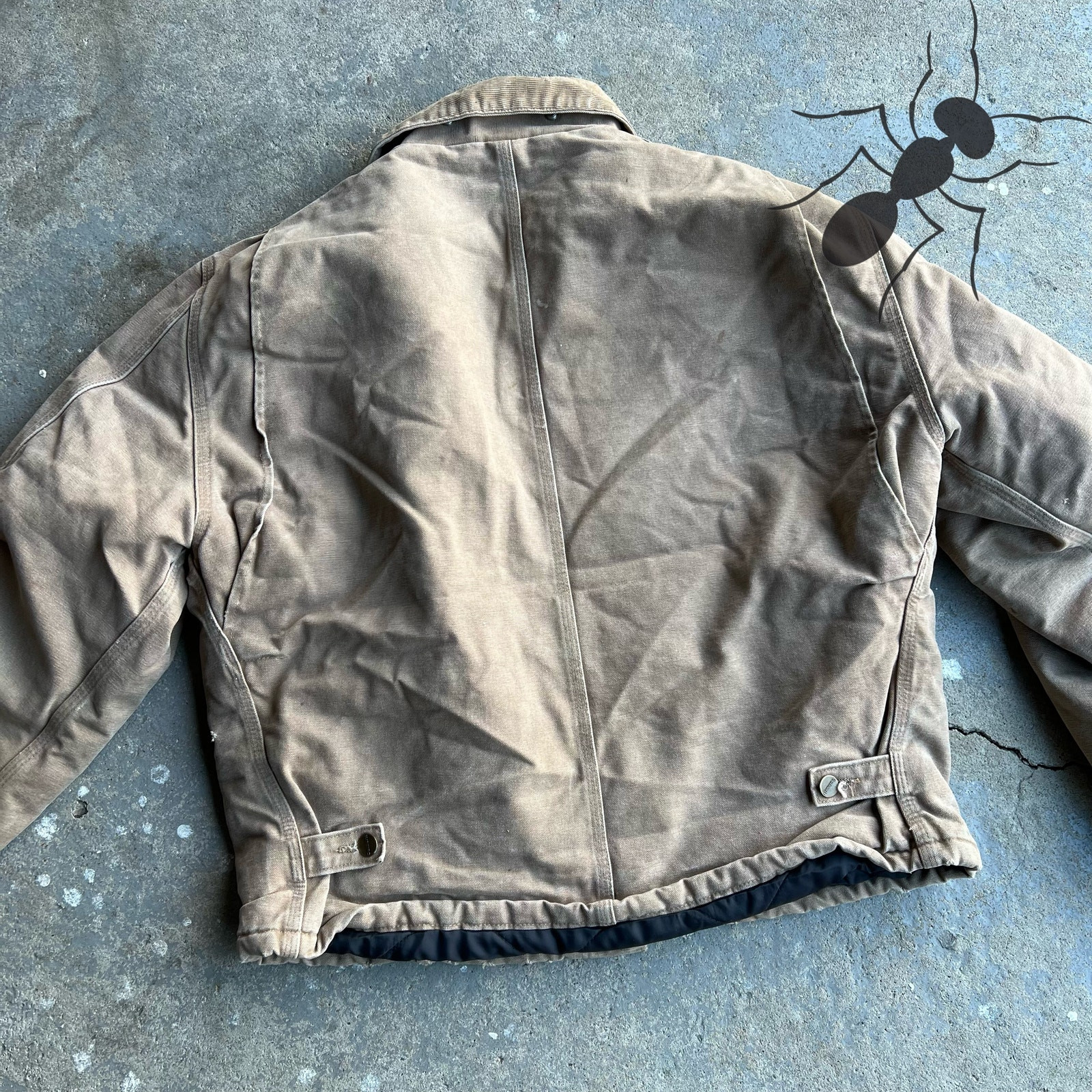 Vintage Carhartt J02 arctic style cropped work wear jacket. Not sure what the color code was but it looks like a super light brown. Beautiful cream/brown color with the light collar as well. Real nice one but does have staining so see the pics. No size tag but measures 25x25.5. Please check measurements before purchasing. I do my best to show any flaws in pictures. Quick shipping! Bundles encouraged! @ants_haul on Instagram.