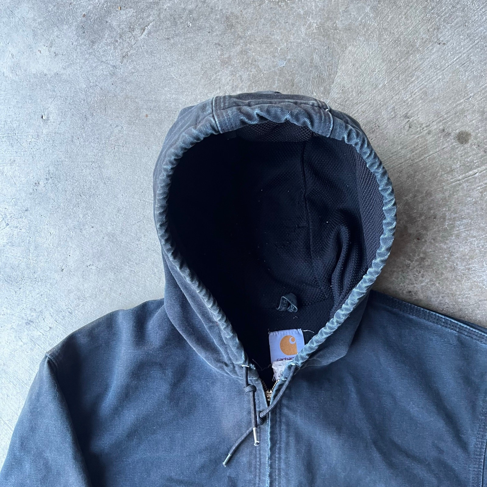 VINTAGE CARHARTT JACKET HOODED J131 BLK NO ZIP PULLER MENS LARGE BLACK WORK COAT beautiful color measurements, and tag shown in pictures item is preworn and may have defects shipping every wednesday and sunday