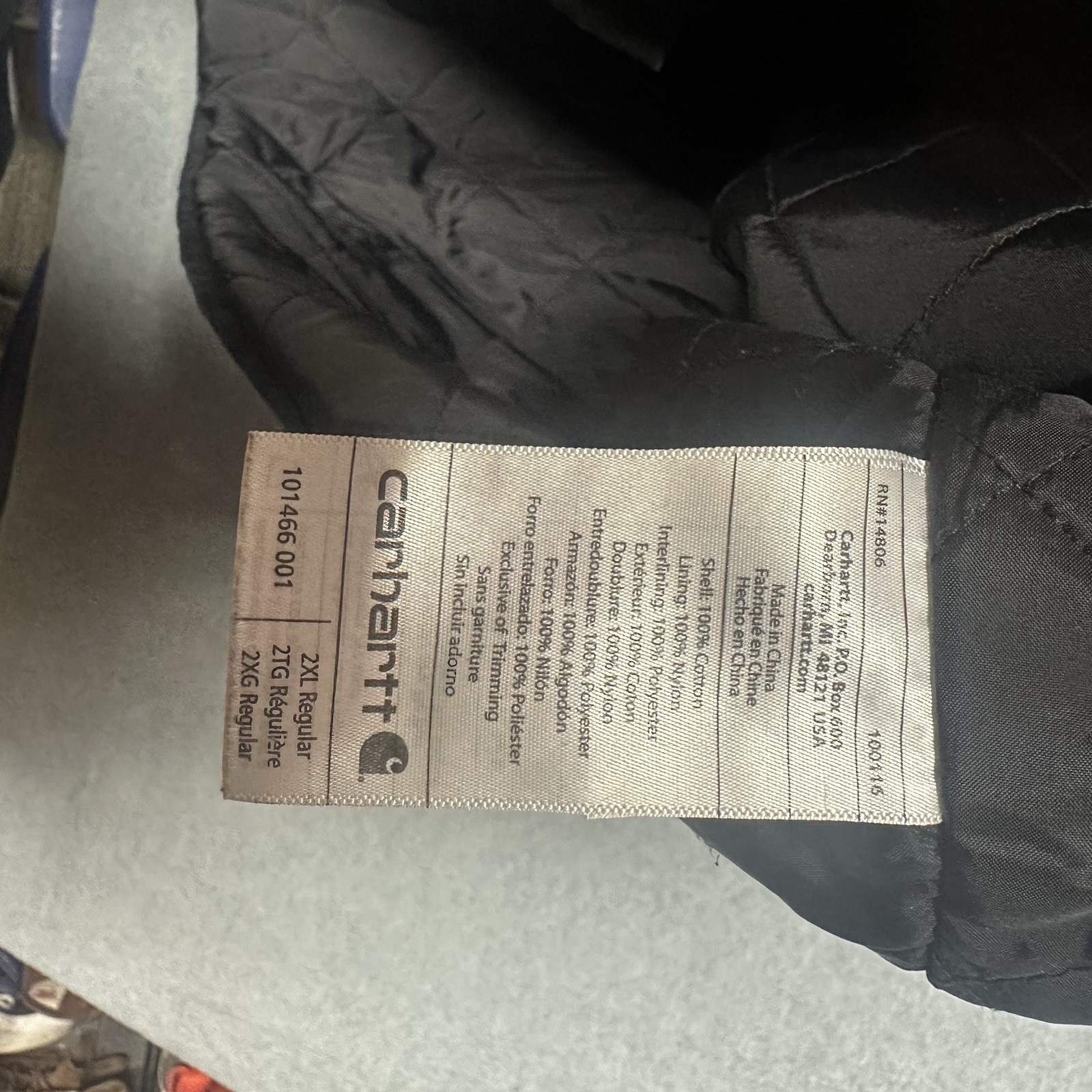 This Vintage Carhartt Jacket is a 2XL black duck canvas quilt-lined chore coat with a mid-length overcoat style. Made with a cotton outer shell and nylon lining, this jacket features a spread collar, full zip closure with a hook and loop, and multiple pockets for functionality. The jacket also includes polyester insulation, making it suitable for travel, casual, and workwear occasions, with a retro 90s outdoor theme. The Carhartt C26 model is machine washable and proudly made in the United States, showcasing the brand's iconic logo.
