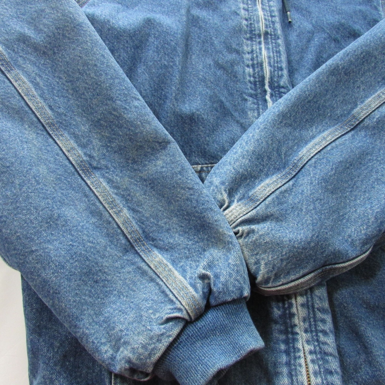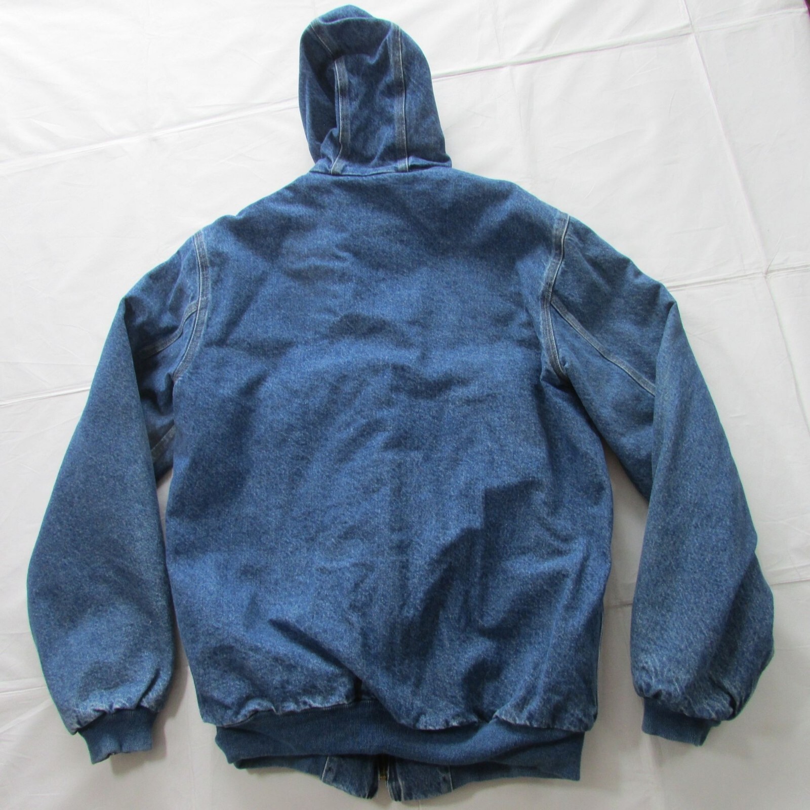 VINTAGE Used condition Smoke Free home Has some piling on inside lining and Very light discoloration on bottom side of right arm (can't get it to show up in pics) Has some fading around wrist cuffs, along zipper, and pockets. NO HOLES All zippers work Men's Size Medium Tall Brand: Carhartt Model: J139DST Long Sleeve Denim Hooded Full Zip WInter Jacket Coat