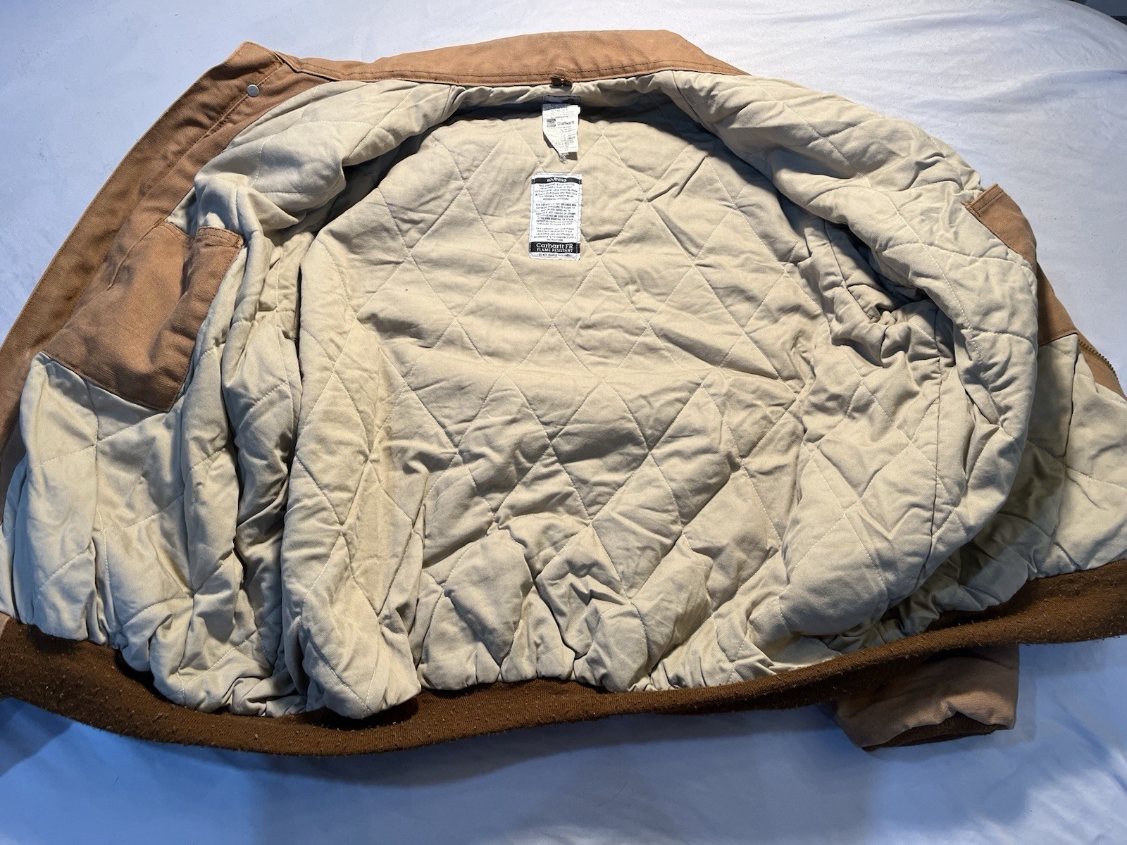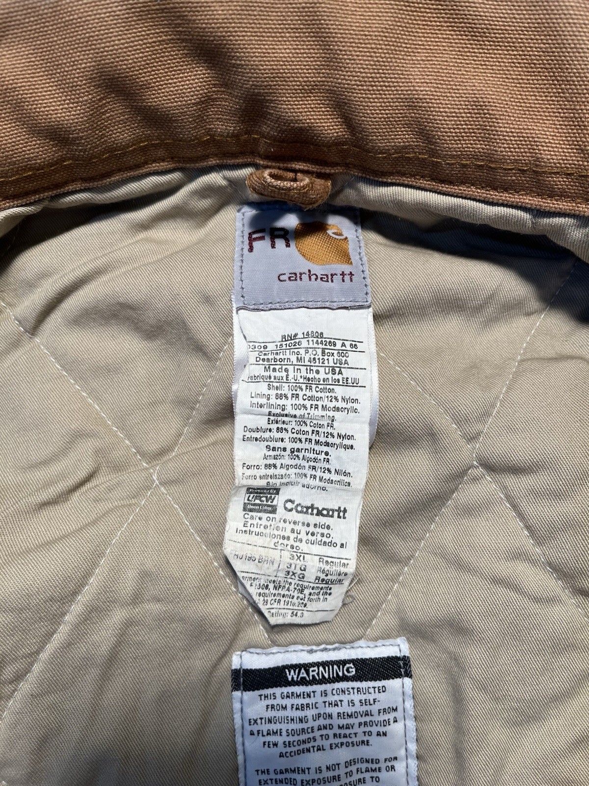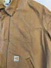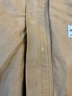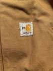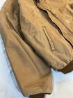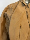 The Carhartt FR Brown Jacket HJ195 BRN in Men's Size 3XL is a classic bomber jacket made of cotton canvas with a spread collar and full zip closure. It features a lined interior with a cotton and nylon lining for added warmth during the winter, fall, and spring seasons. Jacket looks good in person Jacket is distressed