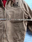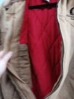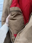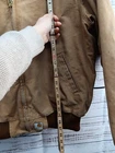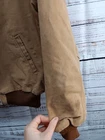 This vintage Carhartt jacket for men is a size 2XL in brown with a solid pattern. The outer shell is made of cotton canvas, while the lining is polyester with quilted accents for added style and warmth. The bomber style jacket features a flannel lining and synthetic insulation, perfect for colder weather. The Carhartt J13 Santa Fe model exudes a classic USA theme and is designed for regular fit. Please note these jacket has some stains around the front area and back please refer to pictures for condition thank you