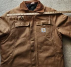 Vintage Carhartt Jacket Men’s 42 Work Lined CQ186 Chore Barn Coat Farm Has Asgrow patch above right top pocket Made by union labor in the USA Has snaps for a hood under the collar, but no hood