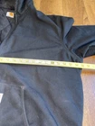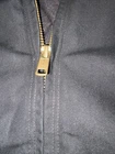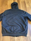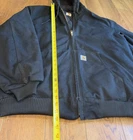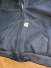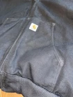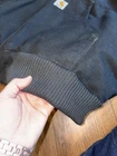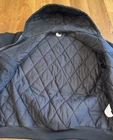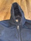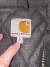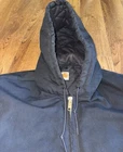 Fit is XL Tall. This vintage Carhartt Men's Quilted Hooded Active Jacket in XL size is a classic and durable workwear piece perfect for cold weather occasions. Made with a cotton canvas outer shell and polyester lining, this bomber jacket features a zip closure, hood, and quilted accents for added style. The black color and solid pattern make it versatile for various seasons like winter, fall, and spring. With a retro theme and made in the USA, this Carhartt jacket is ideal for outdoor activities like walking, hunting, and hiking, adding a touch of grunge and punk to your look.