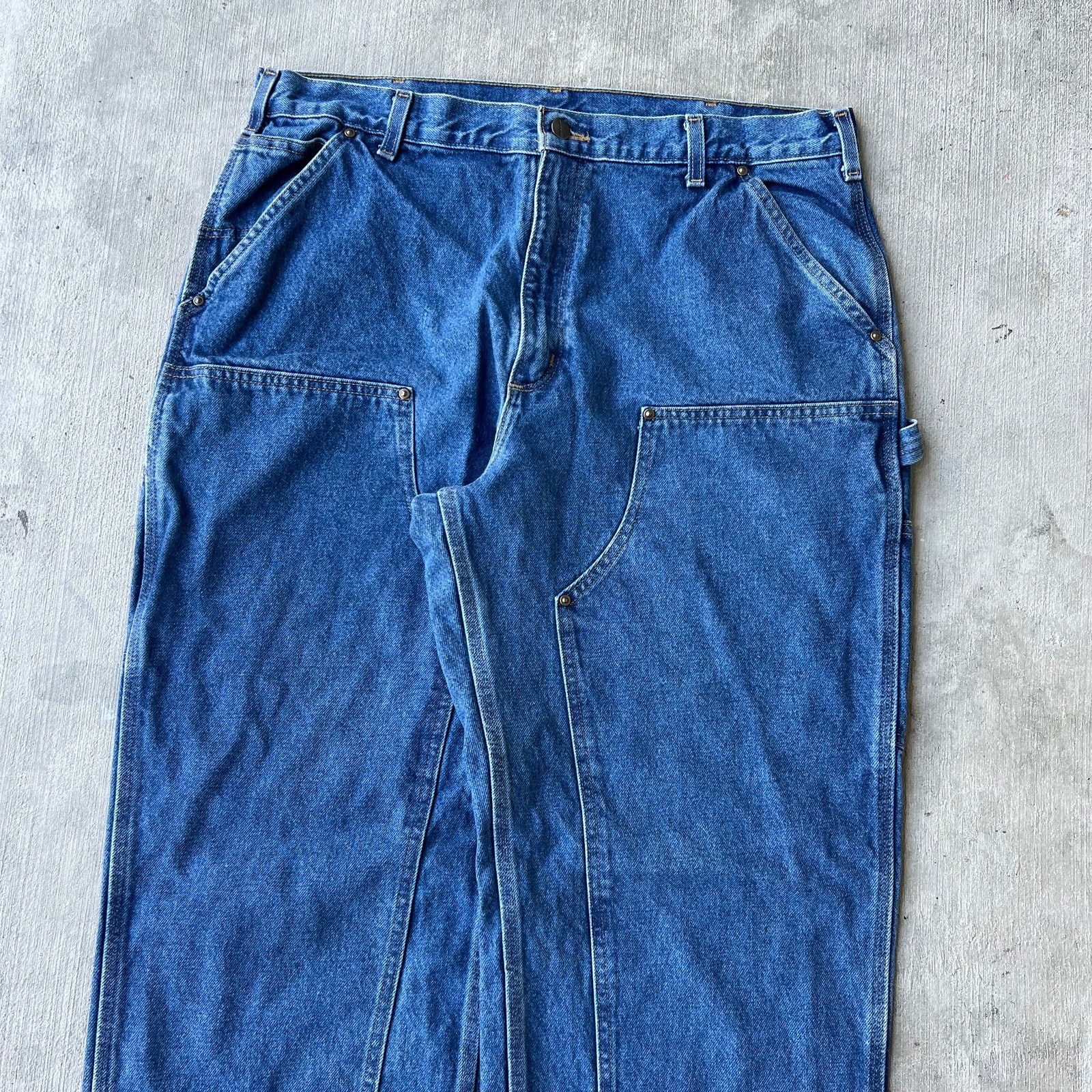 Vintage carhartt blue denim jeans y2k double knee work wear carpenter pants. Great pair. Measure 38x32 and a 9.75 leg opening. Please check measurements before purchasing. I do my best to show any flaws in pictures. Quick shipping! Bundles encouraged! @ants_haul on Instagram. 697!!!
