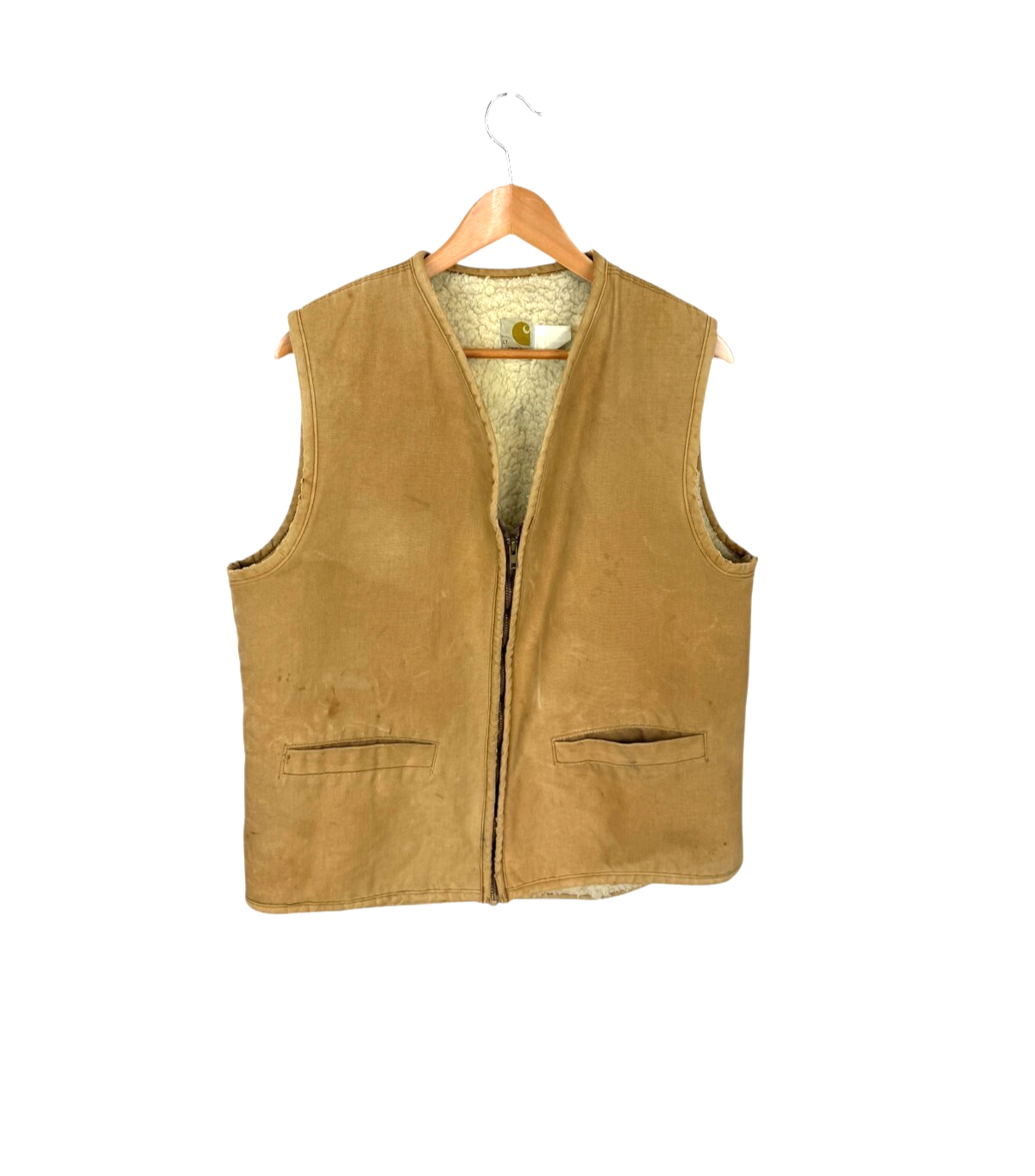 This Sale is for a vintage Carhartt men's vest size large. tan thrashed sherpa pockets lined full zip READ. The vest shows significant wear including multiple stain s exte rior and interior edge wear at neck and armholes. Pictures have been provided. Please review pictures. I recommend using the zoom feature.The vest has the typical thin paper label seen on vintage items. The vest has a vintage Carhartt label but does not have the Carhartt logo on the front. I presume this came off with age and wear. Please examine all pictures before bidding. Please request any additional measurements needed as. Please ask all questions before bidding. My items are stored in a smoke free home pet friendly home however there may be a scent from the previous owner. If you have a problem please message me and I will do my best to work it out with you. Please check out my other items ! Measurements A-A- 23 inches Total Length- 25 inches total hem width- 22.5 inches