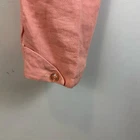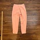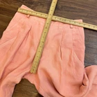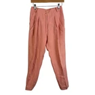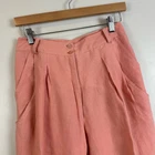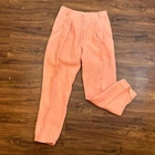 Vintage Carmell 100% Linen Pants Tapered Barrel Leg Pleated High Waist 44 Pink Peach Amazing 100% linen pants with DOUBLE pockets--two layered on each side!--and ankle button details. Tapered leg. Pleated high waist. Color is a lovely pink/peach. Was hard to photograph the color--closeup photos are most accurate. Very good condition with one tiny spot (pictured) and natural imperfections to the linen (nothing noteworthy) Size 44, I believe this is a Spanish size but not sure how this translates to US. See photos for approximate measurements (your measurements may vary). Waist is about 13-14" (so about a 26-28" waist), but note the rise is high (~11"). I'm going to list these as a small, but please examine measurements and compare with something in your own closet to ensure fit.