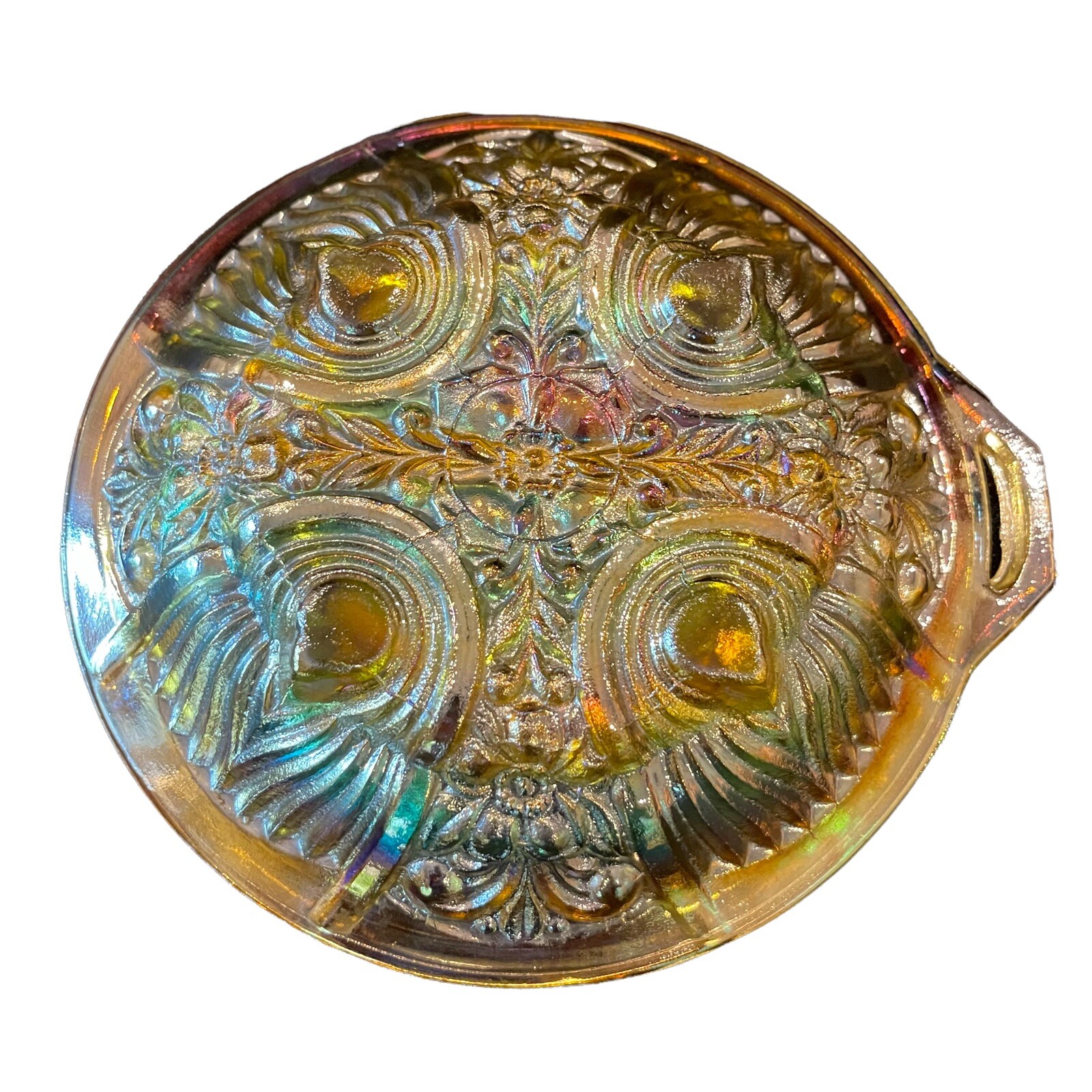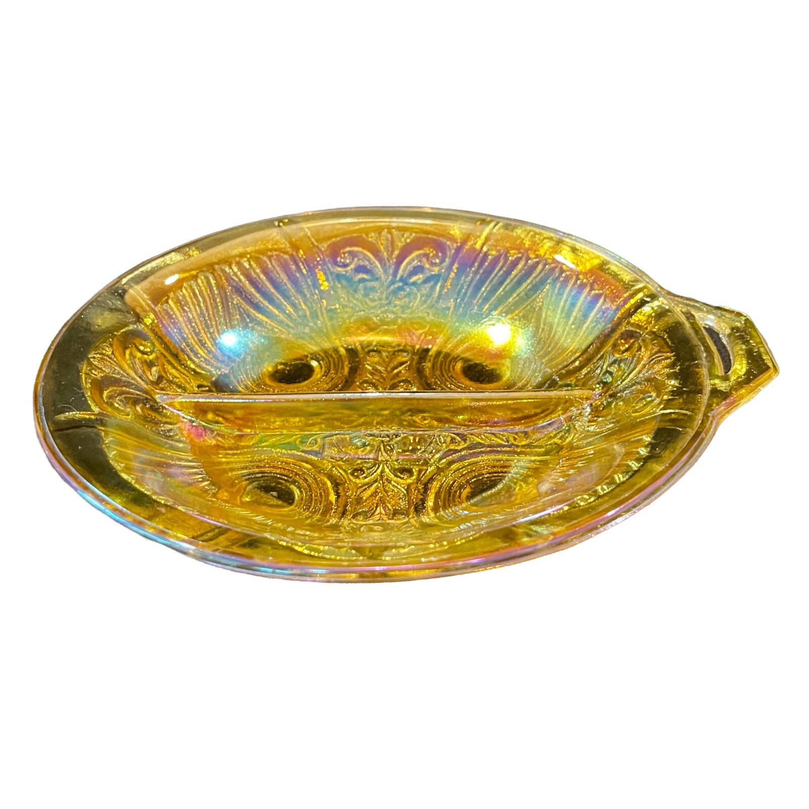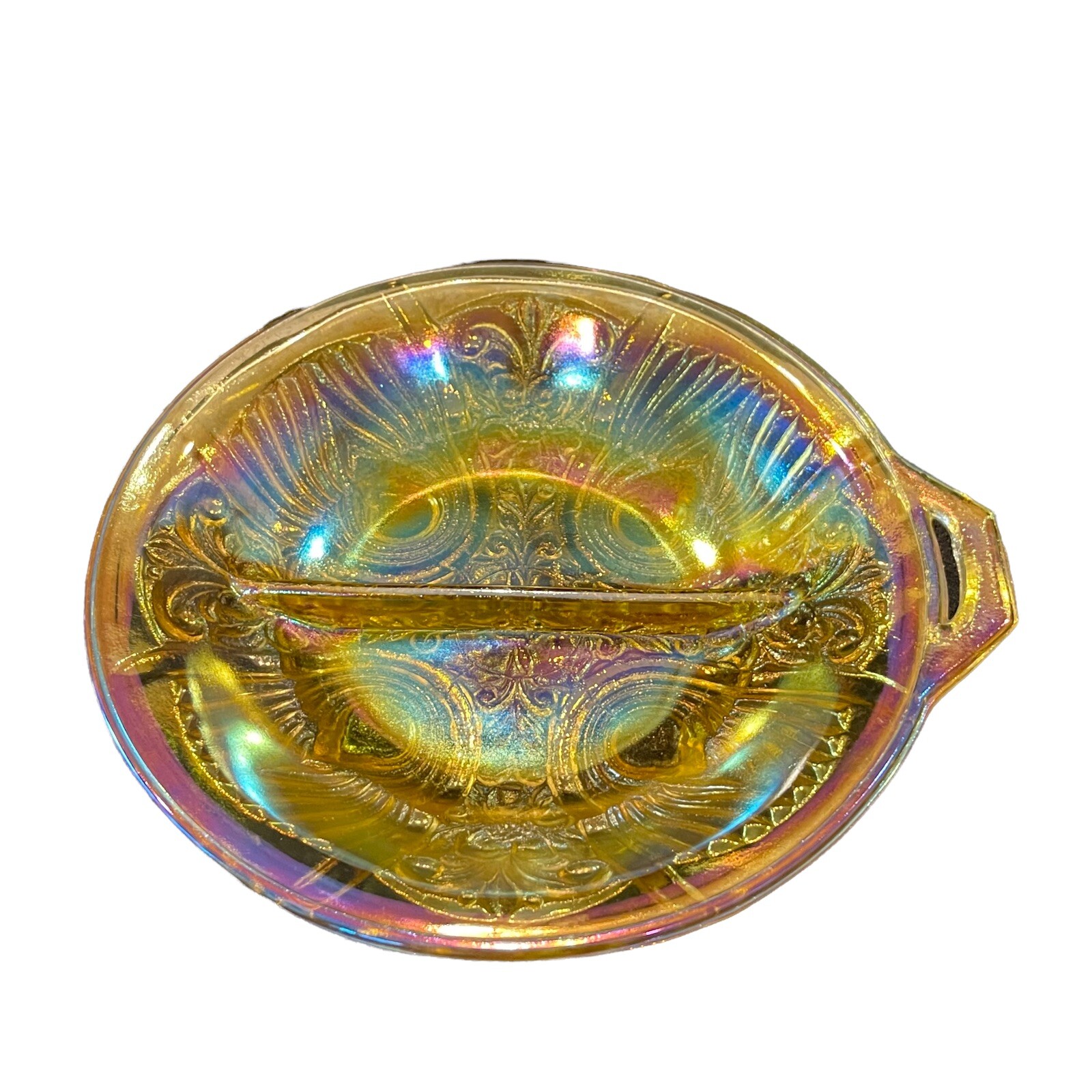 Vintage Carnival Glass Marigold Divided Bowl Candy Nut Dish Depression Indiana 7 1/2" diameter. One handle. No visible signs of wear. Lovely color.