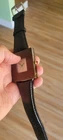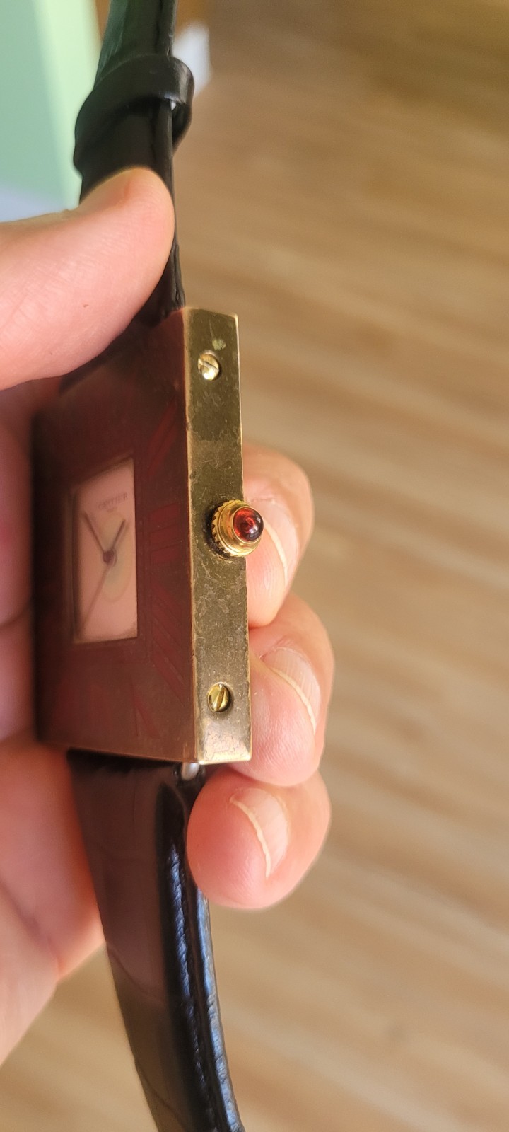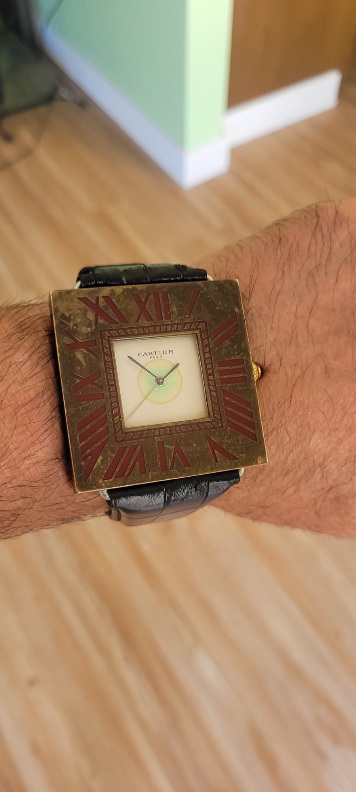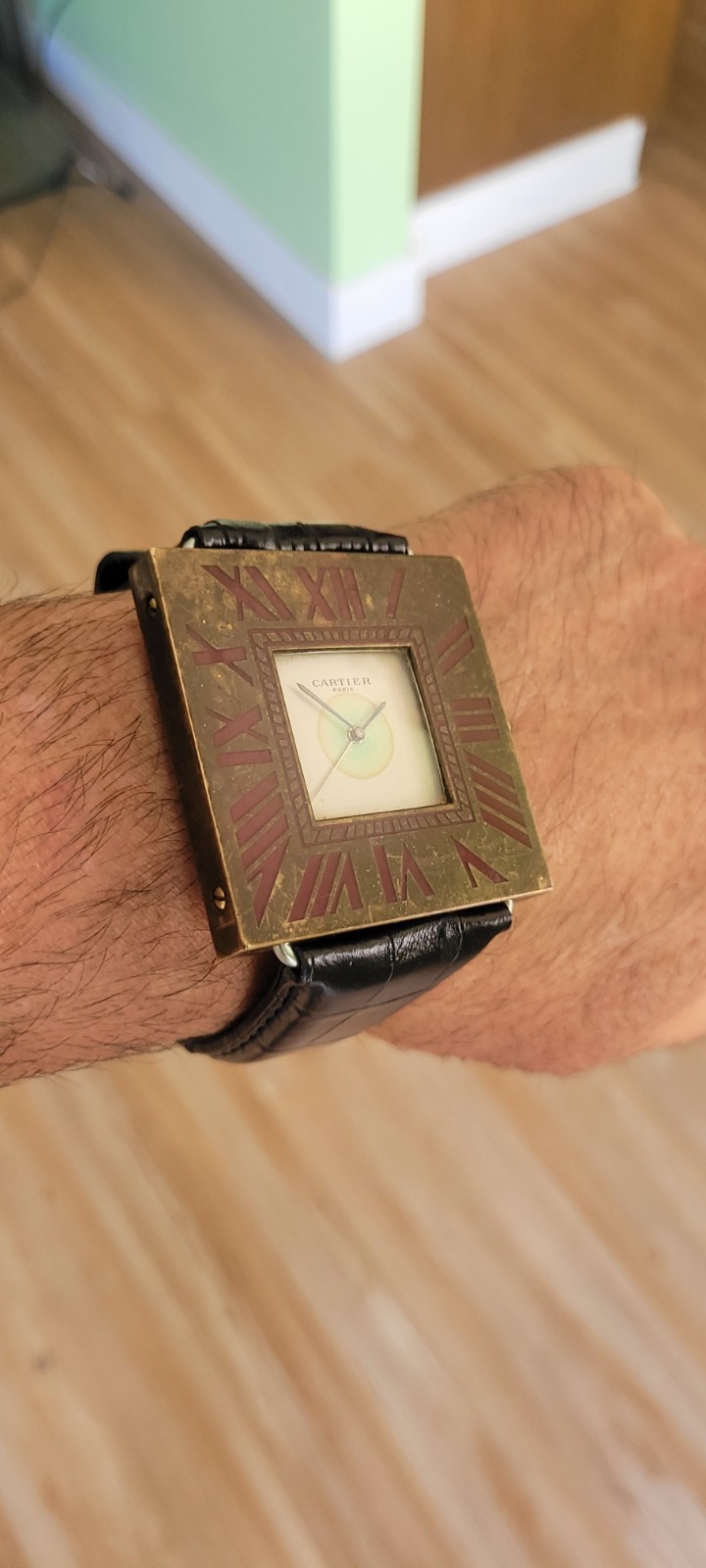 100% Authentic Cartier with enamel Roman numerals and red cabochon crown. improvised lugs, made of a vintage Cartier mini desk clock 50x50mm case as pictured is aged and scratched and never been polished and not working/bad movement sold as is and sale is final! fun to wear as a wristwatch and can still be used as a desk clock with the band on it please read and see all large size pictures and the size and make sure of your purchase