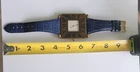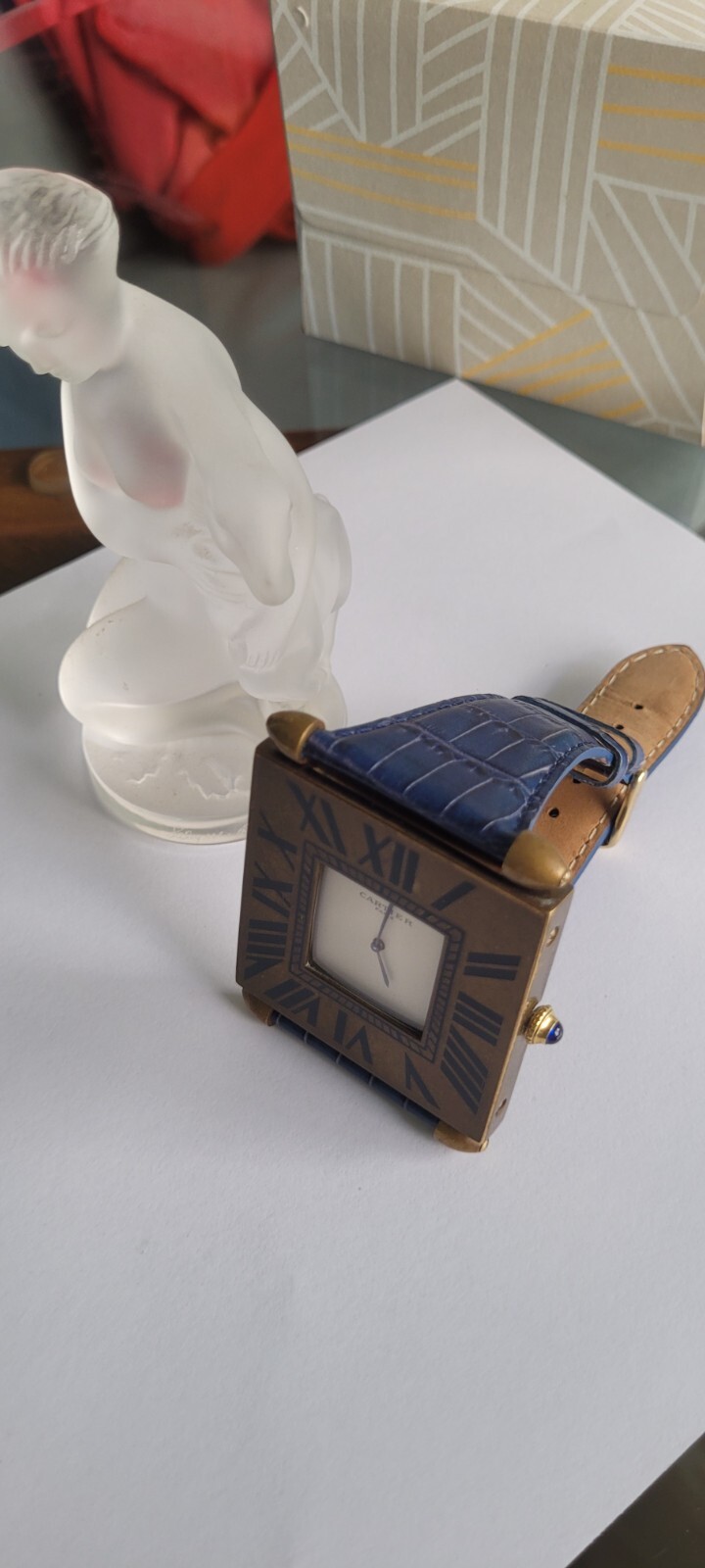 100% Authentic vintage Cartier Paris with enamel Roman numerals and blue sapphire cabochon crown. a great idea ,made of a vintage 80's Cartier mini desk clock we just put a fresh battery in it and runs perfect and the blue band is also new. enjoy it as a wrist watch or when on a desk as a desk clock lots of compliment when worn, looks like a $50000 watch you see it you Love it