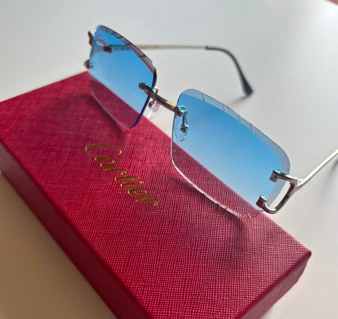 These Cartier rimless vintage sunglasses are pure luxury! The sleek silver frame and blue gradient lenses give off a high-end, exclusive vibe. The Big C decor adds a bold touch, while the polarized lenses make them as functional as they are stylish. Perfect for anyone who wants to stand out with a sophisticated, fashion-forward look. Love how lightweight and comfortable they are—definitely a statement piece worth owning!