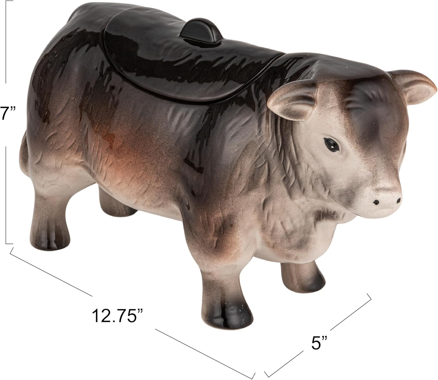 Store New Arrivals Add to Favorite View Feedback Contact Creative Co-Op Vintage Ceramic Cow Shaped Cookie Jar Description Item model number DA9362 Item Weight 2.7 pounds Warranty Description None. Assembly required No Dishwasher compatible No Batteries required No Product Dimensions 12.75 x 5 x 7 inches Care instructions Microwave Safe, Hand Wash Country of Origin China Volume 75 Liters Manufacturer Creative Co-Op Is Discontinued By Manufacturer No Included Components Cookie Jar Made with ceramic Microwave Safe Opening: 4.75"L x 3.25"W x 3"H Hand wash only 12.75"L x 5"W x 7"H Every visitor to your kitchen will comment on this black and brown cow. Imagine how great it will look on your counter full of cookies or other goodies for loved ones. It can also store tea bags or packets of creamer for easy access. Measures 12.75"L x 5"W x 7"H while the opening measures 4.75"L x 3.25"W x 3"H. ABOUT US We offer the best prices around on high quality products. Our E-store includes media such as books, movies, music and games while offering electronics, toys, sporting apparel, clothing, tools, general home, garden items and more. SHIPPING We are always working hard to ensure your package arrives as soon as possible. Please understand that some factors like weather, high postal traffic, and the performance of shipping companies are outside of our control. We offer free shipping to the lower 48 states and ship within 2 business days of payment, usually sooner. We do not accept P.O. Boxes. Please provide a physical address. RETURNS We offer a 30-Day Return Policy on items which you are not completely satisfied with. You have the option for a full-refund or an exchange of the item. No returns are available on items shipped outside of the USA. PAYMENT We accept PayPal. CONTACT US This page content is yet to come Please ad us to your favorite seller and visit again later Thank You CUSTOMER SATISFACTION We try our very best to make sure every customer is completely satisfied. If there's a problem, message us! We're happy to help.